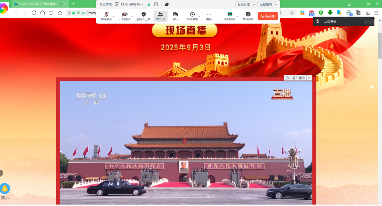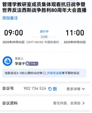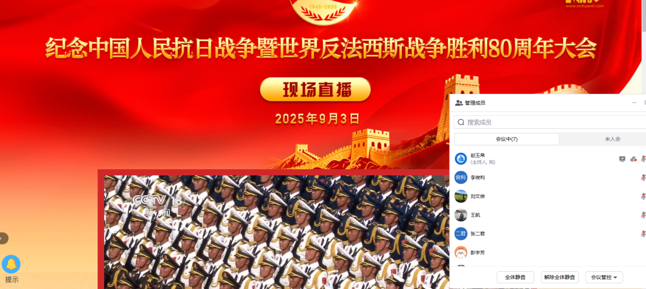 2025年9月3日上午9时,在管理学教研室主任兼党支部书记赵玉帛组织下,教研室全体成员齐聚线上会议室,共同观看中国人民抗日战争暨世界反法西斯战争胜利80周年大会直播,旨在让教研室成员铭记历史、缅怀先烈,汲取奋进力量。