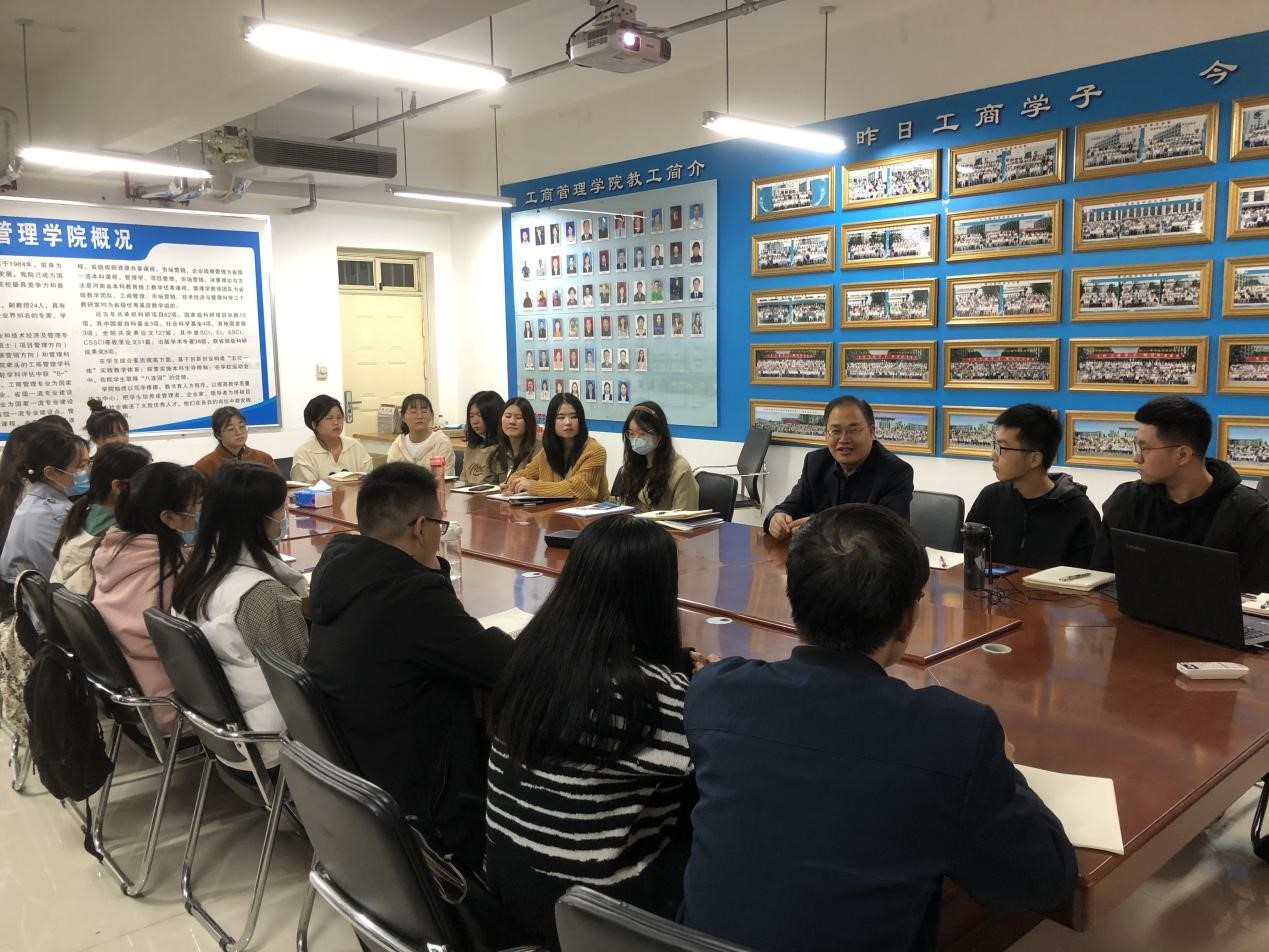 会议开始,蔡树堂首先对我院以往研究生就业情况、研究生的未来就业形势做了回顾和指导,他指出当下研究生应该夯实学术研究功底,积极申报博士研究生。接着,我院研究生2020届毕业生,现四川大学在读博士研究生马小娜以及对外经济贸易大学在读博士研究生余彩婷分别从考博的动机、确定读博后的硕士期间的规划、申博前期的准备工作、如何联系导师等做了共性上的分享,她们结合自身申请考核的经历就如何准备笔试和面试做了经验分享,并指出论文的硬性要求和英语学习在申博过程中起到重要作用。郭萌萌老师和在场的部分研究生围绕“如何确定研究计划的主题”、“申博对论文作者顺序的要求”、“英语复试内容的情况”、“和博导如何交流互动”、“博士毕业对文章发表的要求”等问题向马小娜、余彩婷进行现场互动和交流。在场的研究生通过交流对读博的申请考核制有了一定的认识,也更加清晰自己的申博规划。