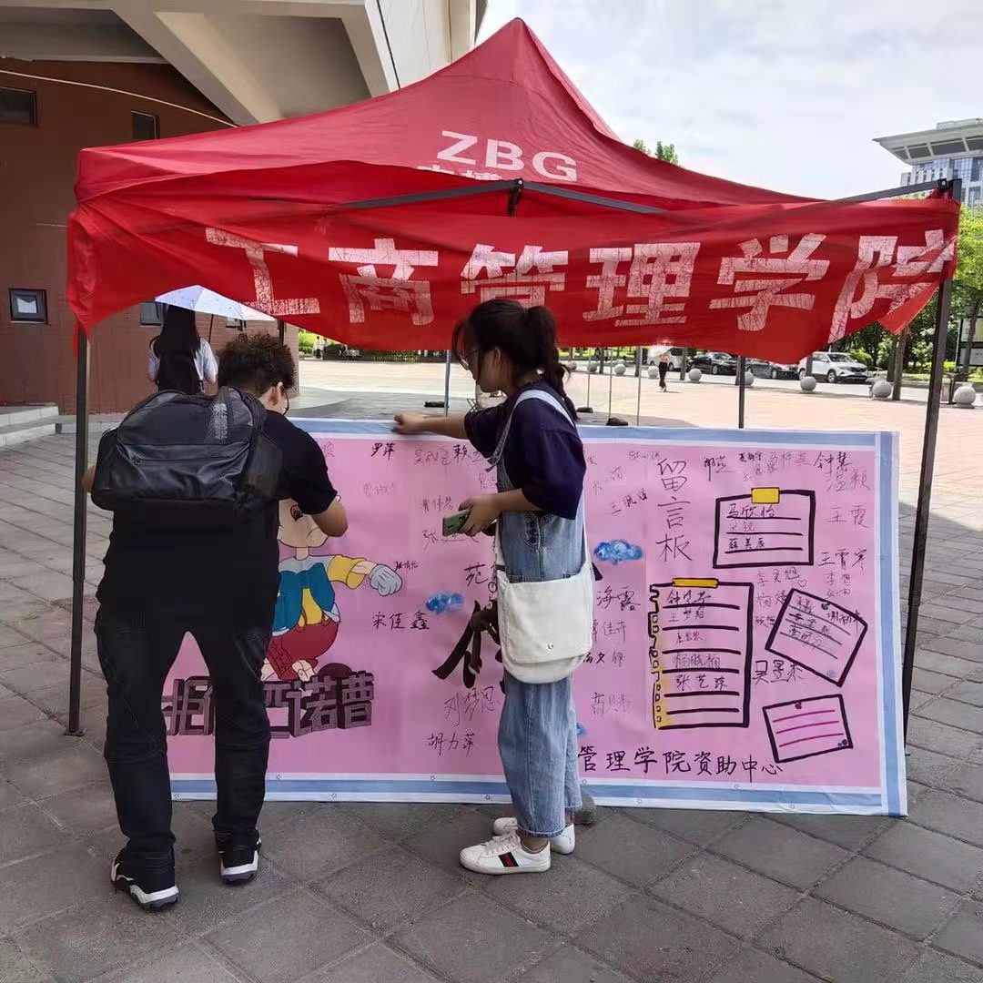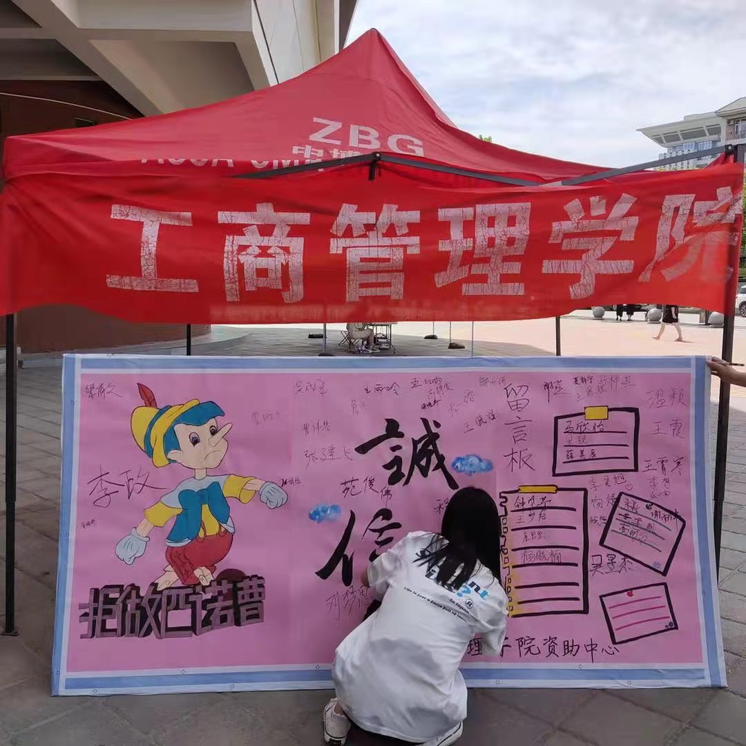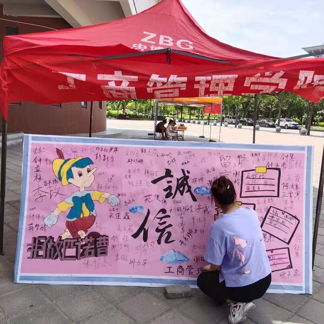 此次活动主要是向全校学生科普诚信教育的相关知识,呼吁同学们自觉做到诚实守信,活动的主题内容以展板的形式呈现。学院工作人员在二餐南门前搭建帐篷并摆放好展板,热情地向路过的学生宣讲此次诚信教育活动,并鼓励他们在诚信教育展板上签名,也动员他们积极向身边同学宣传诚信活动,让更多同学增强在生活中的诚信意识。活动中,路过的一对父子也在此停留,父亲说诚信是中华民族的传统美德,积极鼓励孩子在留言板上写下自己的名字,小朋友一笔一划的写下自己的姓名,代表着自己对诚信的认知。