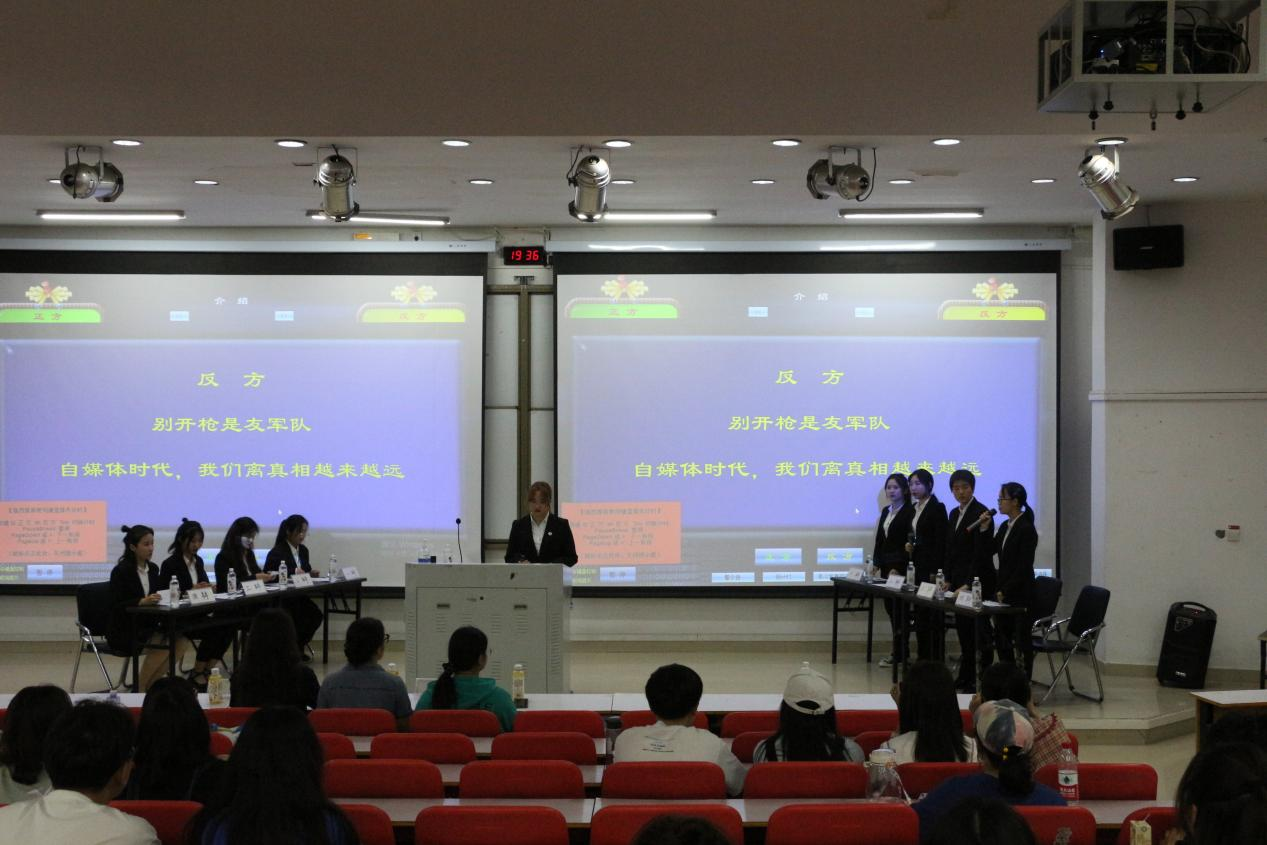 连日来,经过多场角逐,最终脱颖而出的两支优胜辩队来到了本次决赛的现场,以“自媒体时代,我们离真相越来越近还是越来越远”为题进行辩论。比赛中,辩手们发挥出色,唇枪舌战,通过古今人物实例和身边学习生活案例展开论辩。正方慷慨激昂,条理清晰,阐述了他们的观点“自媒体时代,我们离真相越来越近”,反方四位辩手毫不示弱,思路明确,据理力争己方观点“自媒体时代,我们离真相越来越远”。最精彩的莫属自由辩论阶段,双方你来我往、见招拆招,紧盯对手的表述漏洞而反客为主,犀利的言辞,幽默的反驳,灵敏的反应,将辩论赛的氛围推向了高潮。观众们激情高涨,在精彩的观众提问环节之后,比赛进入总结陈词,双方四辩对全局进行梳理并针对对方逻辑上的漏洞逐一回击,完整巧妙的陈词赢得观众热烈的掌声。评委的现场点评亦让在场学生尤其是辩手们获益匪浅。最后,经过激烈的角逐,正方以2:1的比分取得此次比赛的胜利,正方二辩颜莹莹与反方四辩李春晓获得了“最佳辩手”的荣誉称号并由评委颁发证书。