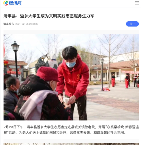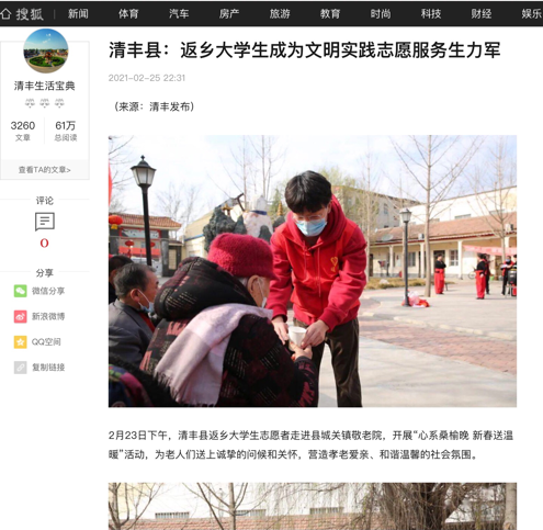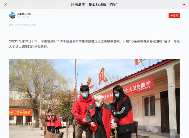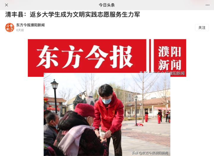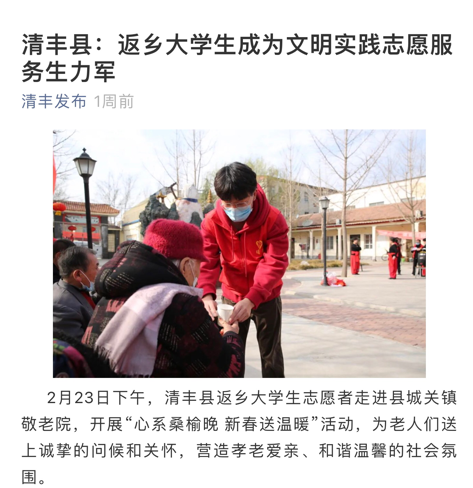 2021年寒假,williamhill英国学生纪帅康返乡后积极响应号召,主动申请加入家乡濮阳市清丰县的暖爱志愿服务队,投身于社会文明志愿实践活动,用青春展现责任与担当。