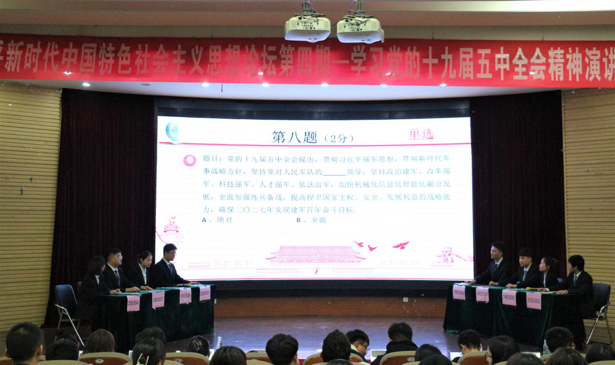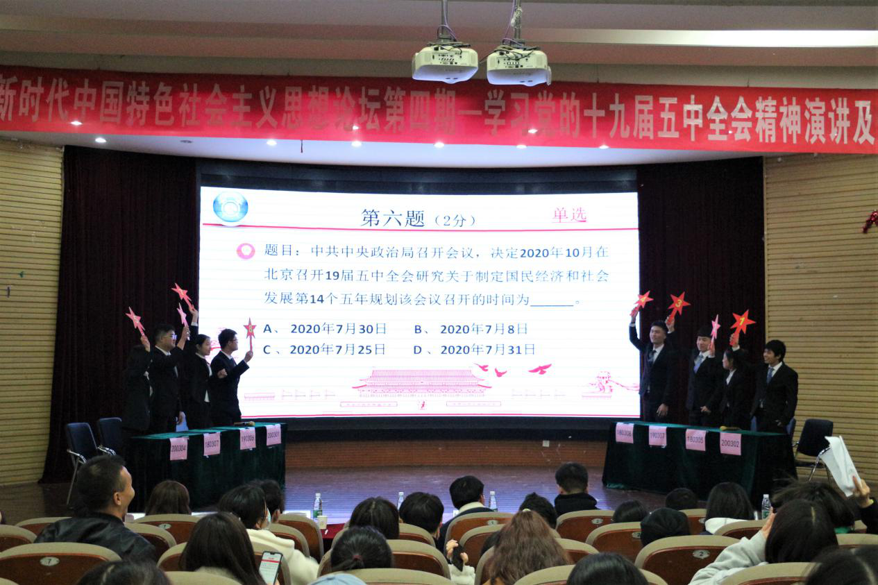 为深入学习宣传党的十九届五中全会精神,11月28日晚,williamhill英国在教1—219报告厅举办第四期“习近平新时代中国特色社会主义思想论坛”——学习宣传党的十九届五中全会精神,近300名学生参加活动。