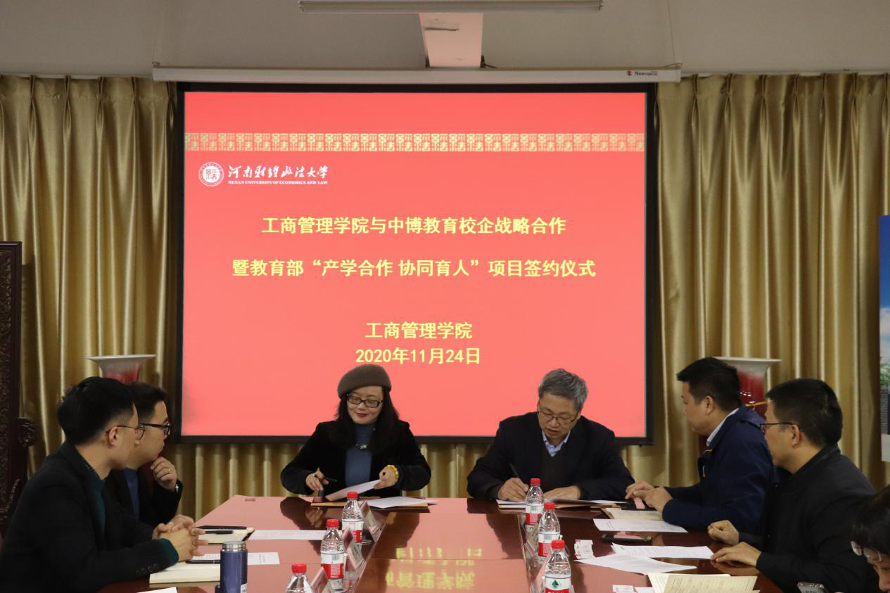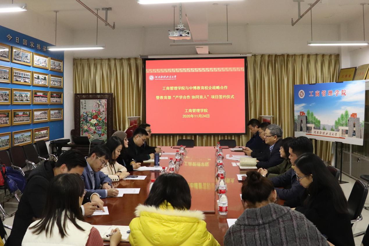 2020年11月24日下午,williamhill英国与中博教育股份有限公司(以下简称:中博教育)校企战略合作暨教育部“产学合作,协同育人”项目签约仪式在教科楼771会议室举行。学院院长牛全保、党委副书记赵辉、副院长王文超、中博教育副总裁毛劲梅等双方相关人员参加了签约仪式。
