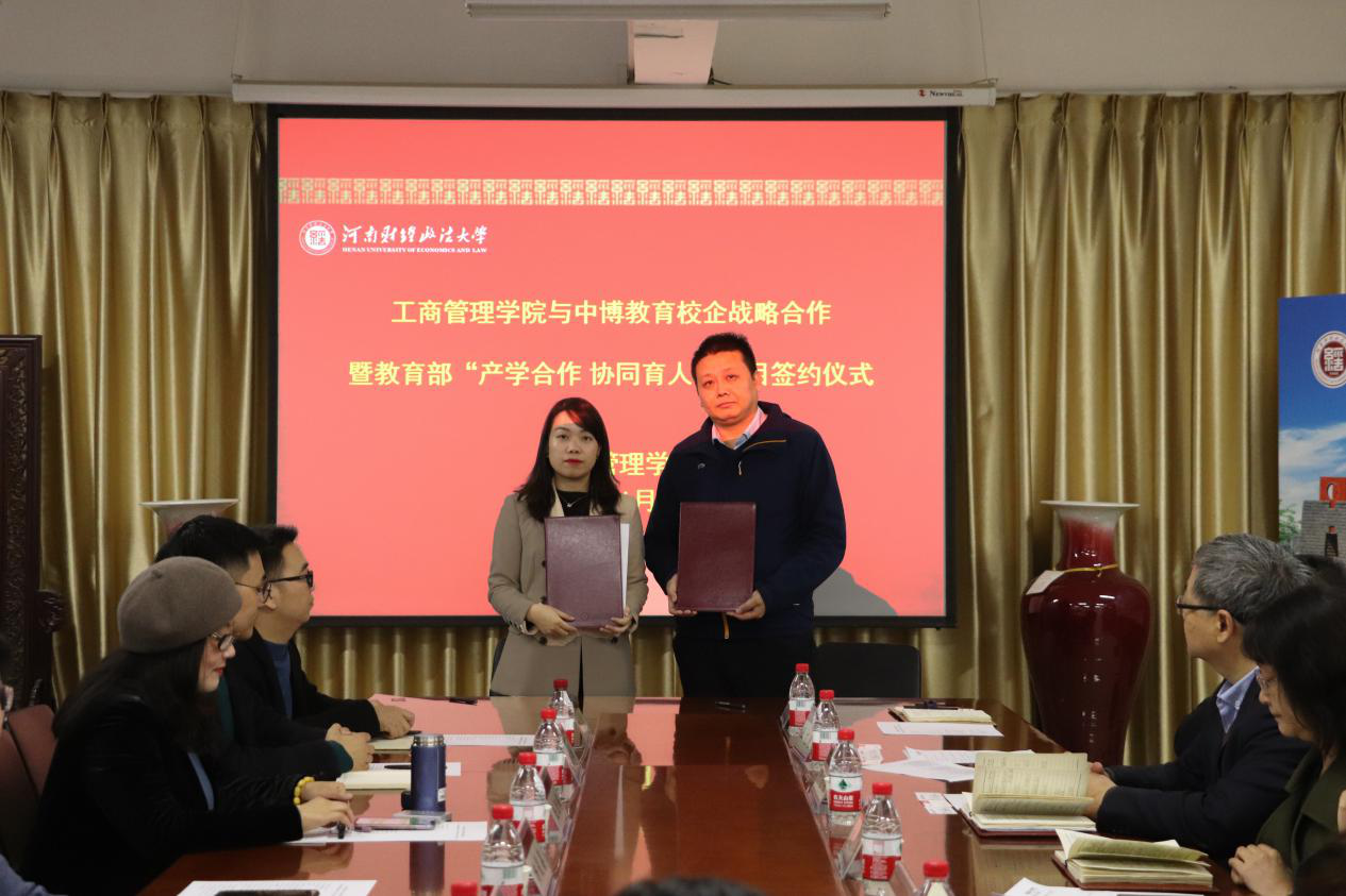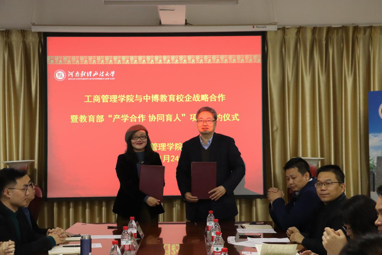 牛全保为签约仪式致辞,他介绍了学院的基本情况和近年来取得的成就。他指出,双方的合作使学校和企业各自的优势得到发挥,人才培养更加符合社会与市场的需求,并特别感谢疫情期间中博公司给学院学生提供的就业支持。这次合作上升到战略层面,合作的内容将更加全面,包括联合培养、师资交流、学生活动、学生就业、科学研究等方面。同时,以教育部“产学合作协同育人”项目签约为契机,双方合作将会更加深入和具体。毛劲梅介绍了中博教育公司的发展历程和今后的发展规划,对学院的支持表示感谢,同时期待更加深入和广泛的合作。最后,双方举行了签约和授牌仪式。