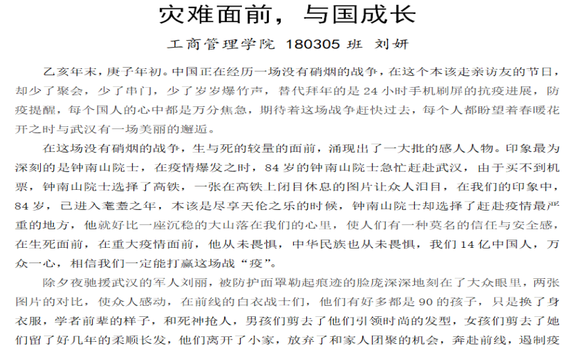 “一次团支部主题教育活动”,开展了“把灾难当教材,与祖国共成长”主题征文征集。各团小组围绕生命教育、信念教育、科学教育、道德教育等,结合疫情抗击战中党中央科学精准的决策部署、各行各业抗疫先进人物和事迹、志愿者事迹、科技助力抗疫、中医在救治中发挥作用、科学防护、禁食野生动物、援外抗疫等丰富实践,同学们畅谈在中国制度优势、中国精神、理想信念、优秀传统文化、科技创新、志愿者精神、文明生活习惯养成、人与自然关系、命运共同体等方面自己的认识和感悟。每个团小组将优秀学习心得报送团支部,由团支部择优向院团委推荐。本次活动,院团委累计收集优秀学习心得体会40余篇。通过本次主题教育,同学们记录了疫情期间的所见所思所悟,表达了将“自身小我”融入“国家大我”的真挚情感,对当代大学生对国家认同感的培养、创新发展和正确价值观的塑造发挥了积极作用。