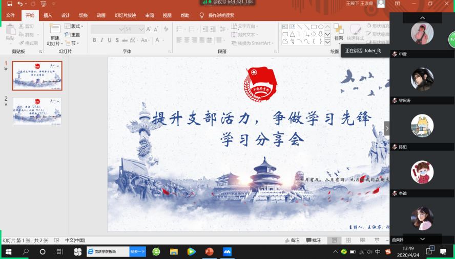 在“一次团支部学风建设活动”中,院团委号召各团小组、团支部举办以“提升支部活力,争做学习先锋”为主题的学习分享会。各团小组自发推荐1-3名学习优异的团员代表做小组交流发言,由团小组推荐1名学习优秀团员参加团支部交流,在最后环节院团委选拔了6位成绩优秀的团员分年级召开了学习交流分享会。在本次学习交流活动中,共开展团小组学习交流216次、团支部学习交流21次、院团委年级学习交流3次。各位学习优秀的团员介绍了自己的学习方法和经验,引导同学们科学学习。通过本次活动,我院团小组、团支部在学风建设中的引领作用得到了进一步发挥,为疫情防控期间我院学生居家坚持自主学习提供了交流的平台。