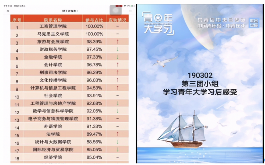 在“一次特色的团日活动”中,各团支部积极动员各团小组推广使用“青年大学习”平台,结合本支部情况开展主题团日活动。活动围绕疫情防控、国家制度优势、大学生理想信念等主题,组织同学们谈心得、讲感悟,制作微宣讲视频。通过网上特色团日活动,开阔了视野,提升了政治素质,更加明确了共青团员的使命和担当。在特色团日活动影响和引导下,我院学生掀起了使用“青年大学习”平台学习的热潮,学习参与率已经累计11次100%。