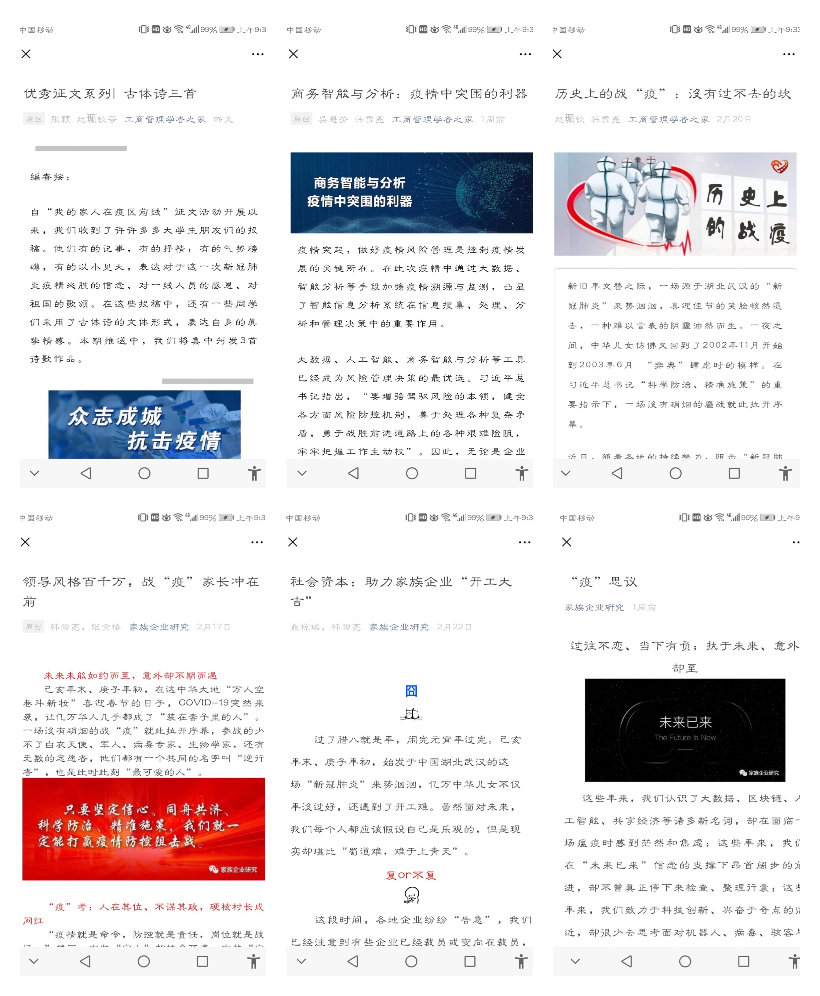 作为公益发起人之一,我院韩雪亮老师积极响应“工商管理学者之家”的号召,带领赵珮钦、张金格、聂琼瑶、吴慧芳等同学成立“williamhill英国抗‘疫’小分队”。一月有余以来,陆续撰写并在网络平台推出《战“疫”:没有过不去的坎》、《领导风格百千万,战“役”家长冲在前》、《社会资本:助力家族企业开工大吉》、《商务智能与分析:疫情中突围的利器》、《“疫”思议》、《庚子去疫》等文章,以学人赤子之心,勇肩时代使命,为谋求疫情下的社会经济发展贡献财大智慧和力量。