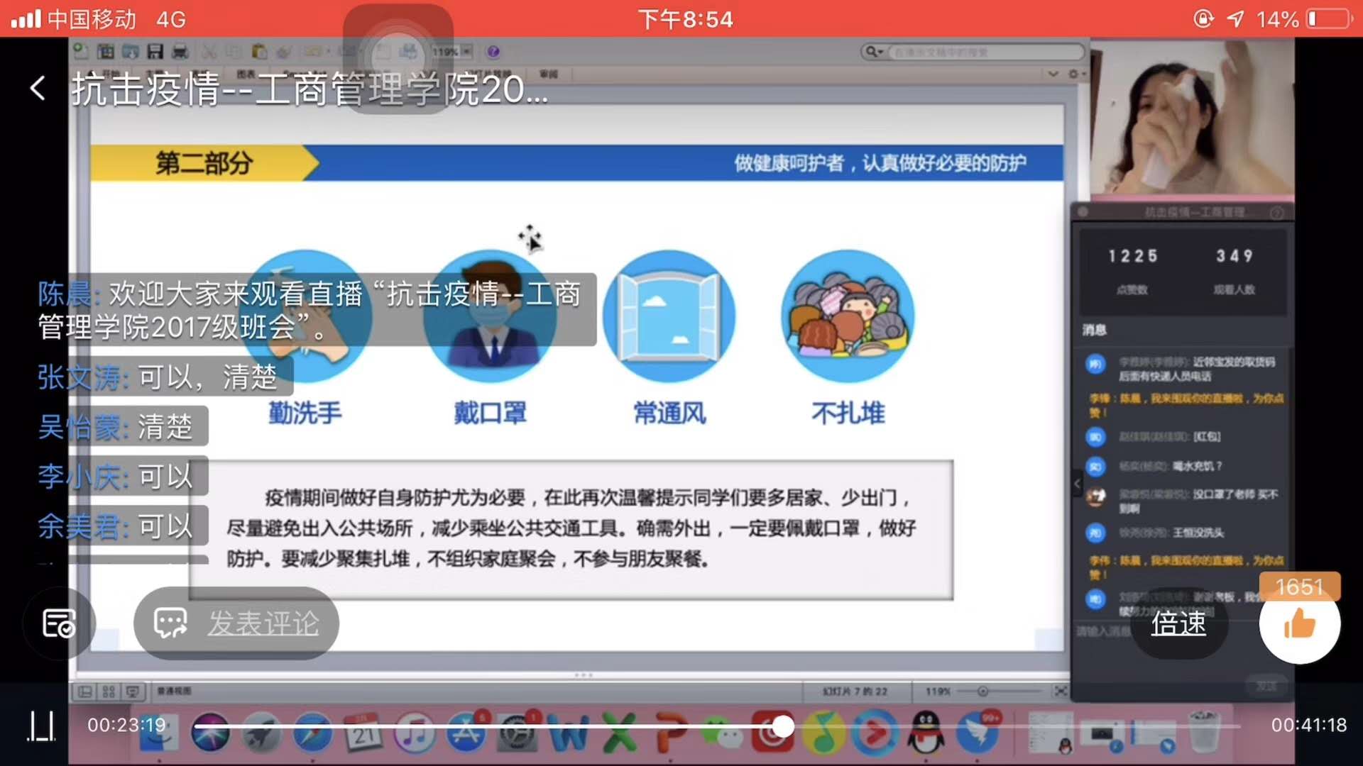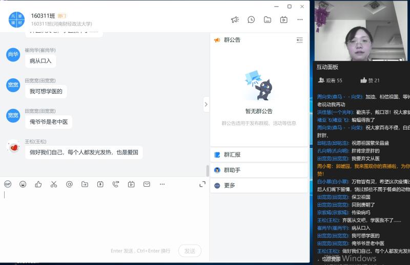 “云班会”并没有因为屏幕的间隔而减少热度,同学们进入直播间后主动向辅导员老师热情的打招呼,纷纷询问开学时间,表达想尽快地投入到校园学习中来的心情,毕业班的同学们则忧心就业、毕业时间等,面对同学们的问题,辅导员老师们耐心答疑解惑,同时倡导大家在入校前担当好五个角色:不离家不返校、遵守纪律,当好校园的守护者;做好防护、调节情绪,当好健康的呵护者;学会生活、乐于学习,当好心理的调节者;学榜样、讲担当,当好居家奋进者和青春的筑梦者。