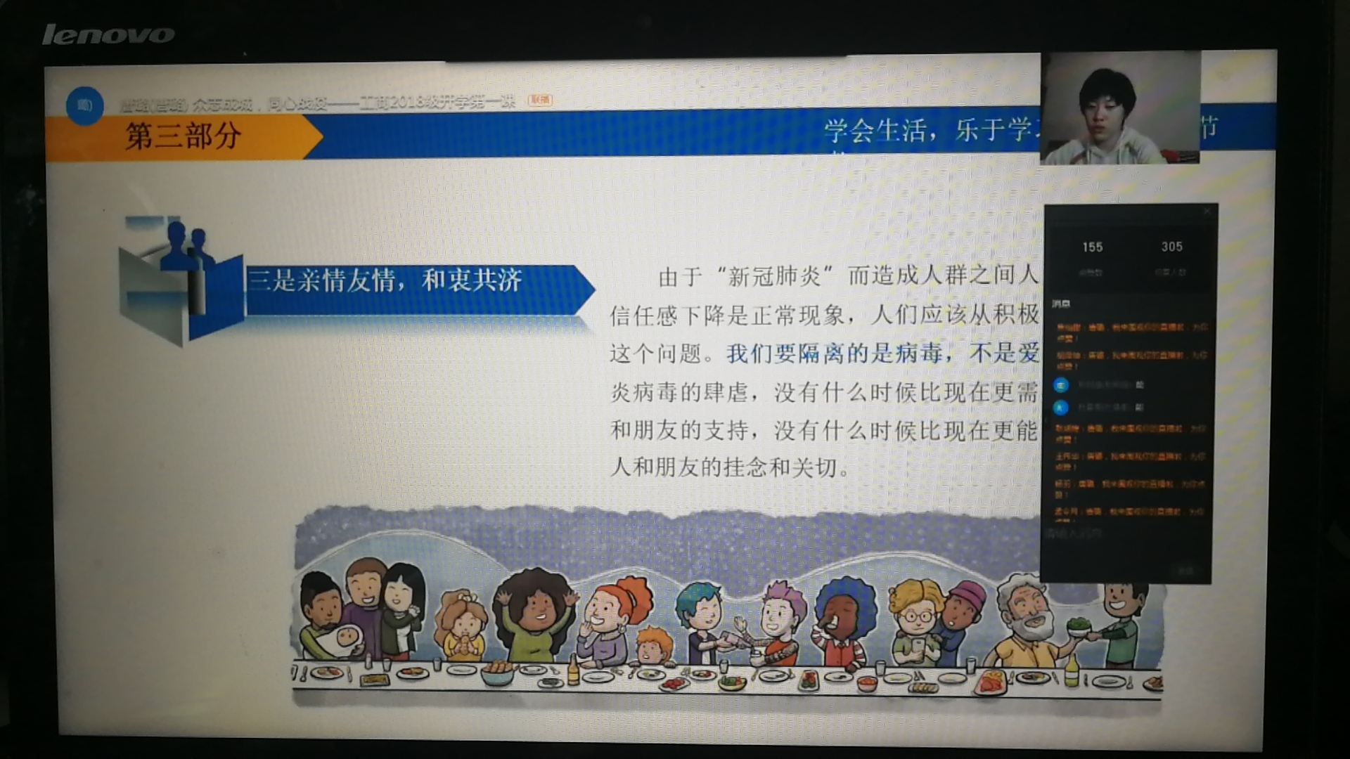 班会内容紧密结合疫情防控的生动实践,辅导员们解读国家政策和部署,普及防控知识,分享抗疫感人故事,进行心理辅导和学习生活指导,提出“四个一”的方法:每天有一个计划、学习一项新技能、一家人有交流时间、坚持一项体育运动。通过主题班会,教育引导广大同学深刻理解中国制度、中国智慧、中国力量的独特优势,树立共克时艰的责任担当意识,增强打赢疫情阻击战的信心和决心。