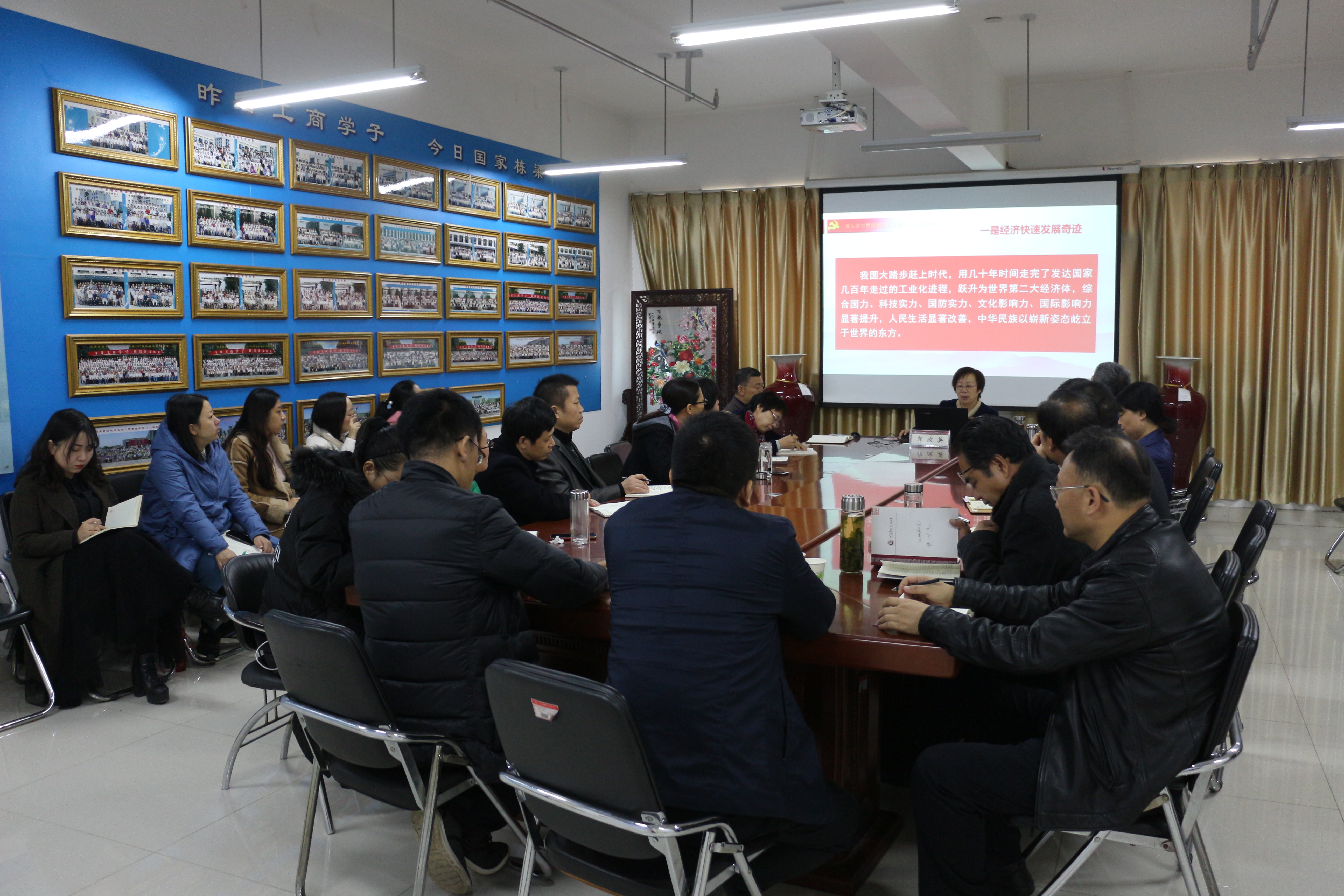 郭改英从充分认识坚持和完善中国特色社会主义制度、推进国家治理体系和治理能力现代化的重大意义等四个方面深入讲解了十九届四中全会的精神内涵。强调了王国生书记在省委常委扩大会议上提出的学习要求:要在深入学习上下功夫、要在研究谋划上下功夫、要在提高能力上下功夫,要在落细落实上下功夫。要求全体师生深刻把握党的十九届四中全会的重大意义,切实增强学习宣传贯彻的政治自觉思想自觉;按照通知要求,通过学习培训、集中宣讲等形式,深入学习领会全会精神的丰富内涵和核心要义,迅速掀起学习宣传热潮。