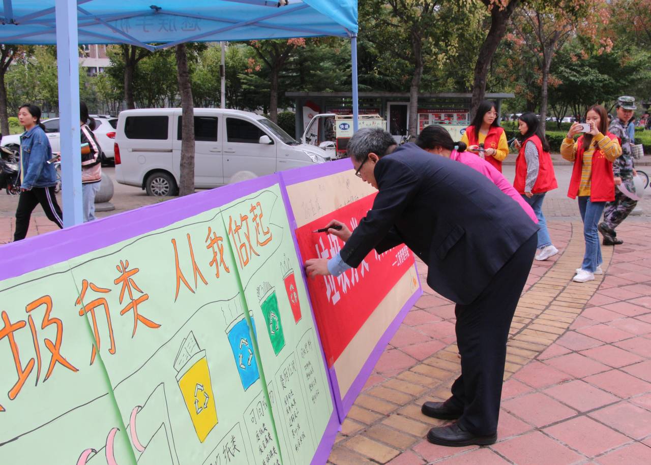 志愿者们在广场放置展板,张贴条幅,吸引了大批师生驻足观看,志愿者们向大家耐心讲解垃圾分类相关知识,回答垃圾分类相关问题,老师和同学们纷纷在“垃圾分类,从我做起”的活动条幅上签字,倡导人人践行垃圾分类,共创文明新风,活动现场气氛热烈。院长牛全保和副书记、工会主席赵辉等领导也欣然前往,在宣传条幅上签字表态,支持环保,率先垂范。