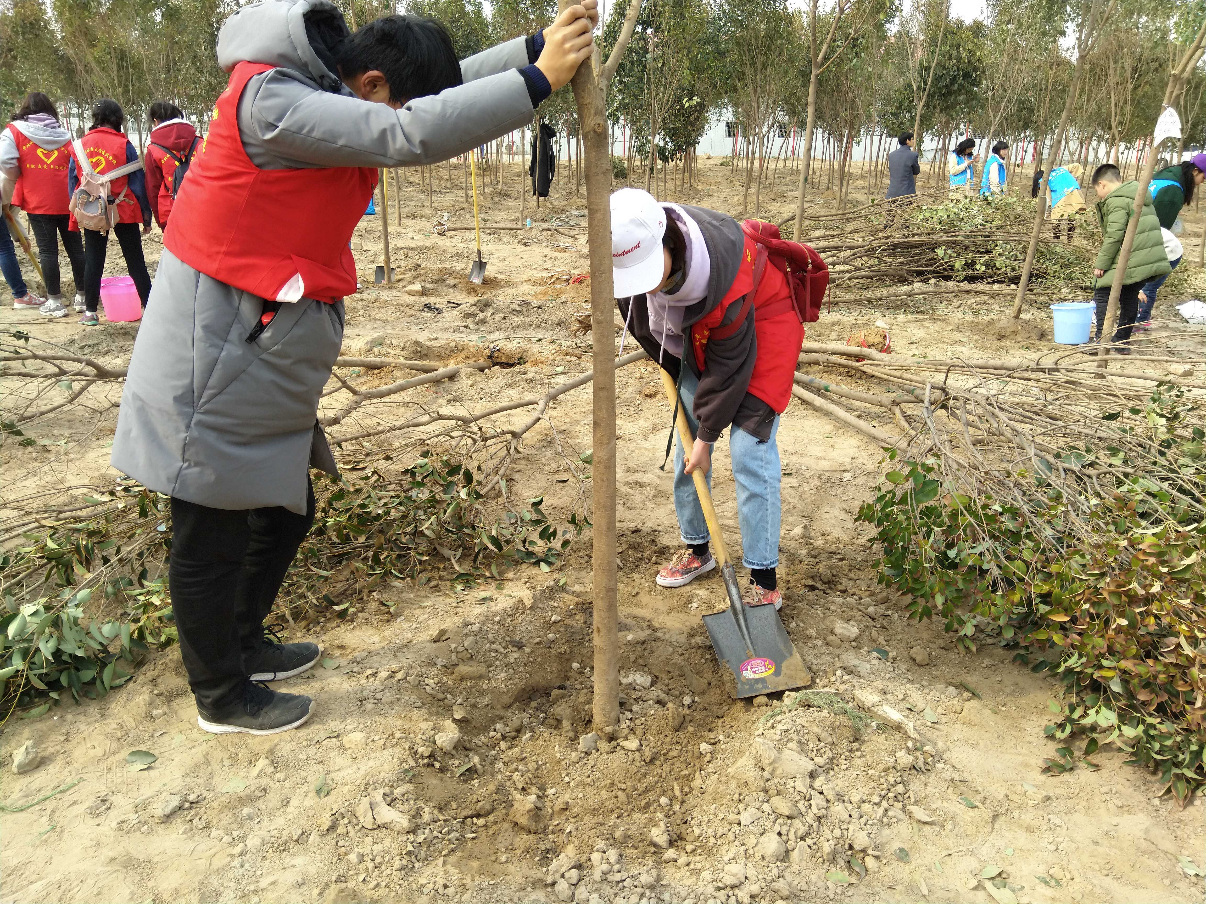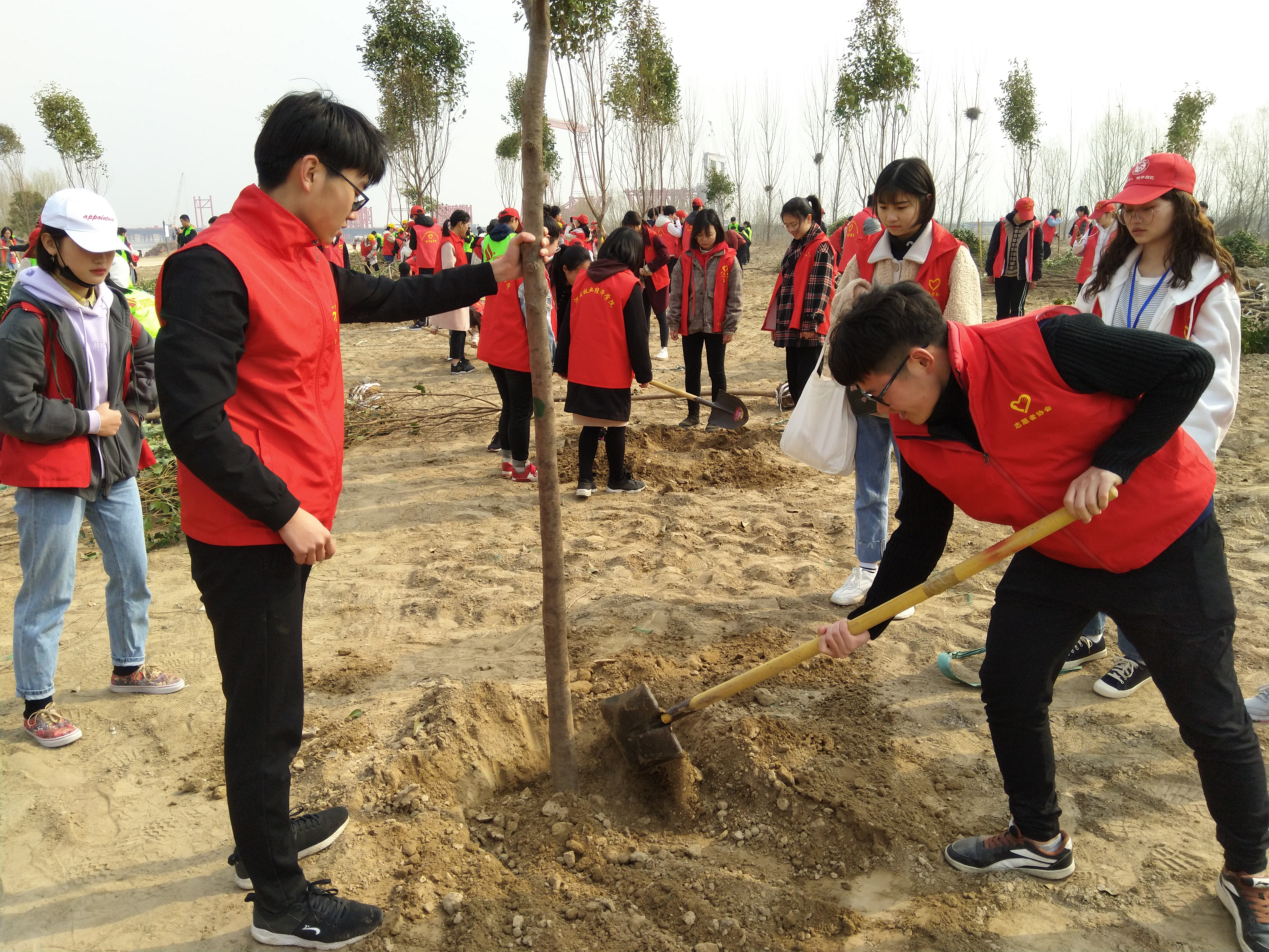 当天早上,志愿者们乘专车到达黄河大堤,挖坑、扶苗、填土、拍实、浇水,干得热火朝天,并为所栽树苗取名留念。