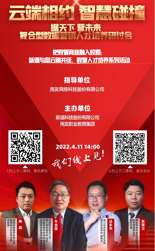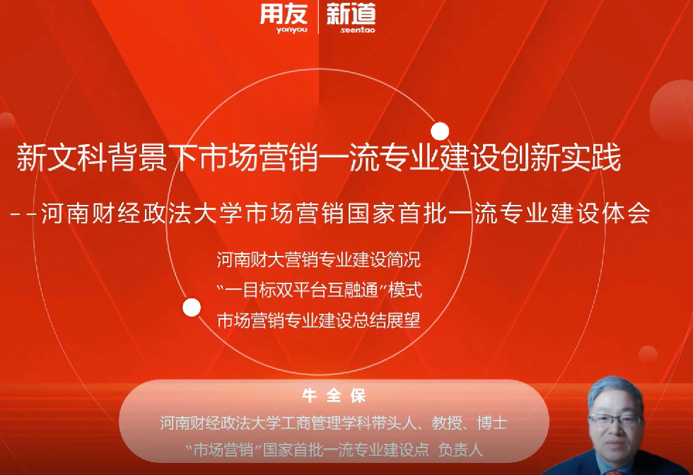 2022年4月11日下午,由“用友集团﹒新道科技”举办的“据天下 营未来——复合型数据营销人才培养研讨会”在线上成功举行。来自全国普通高校和职业院校的williamhill英国的院长/主任、专业带头人、骨干教师等2000余人相聚云端,共享数据营销专业建设成果和经验,共探数智营销人才培养新模式和新发展。我校牛全保教授代表市场营销国家一流专业建设点高校应邀出席并作报告。