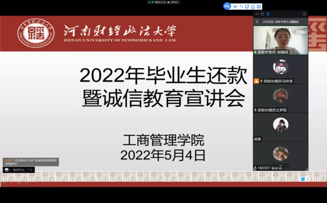 为做好学院国家助学贷款毕业生还款工作,推动国家助学贷款工作持续健康开展,5月4日中午,学院召开线上毕业生还款暨诚信教育宣讲会。本次会议由学院团委副书记郭媛园老师主持,全体贷款毕业生参加。