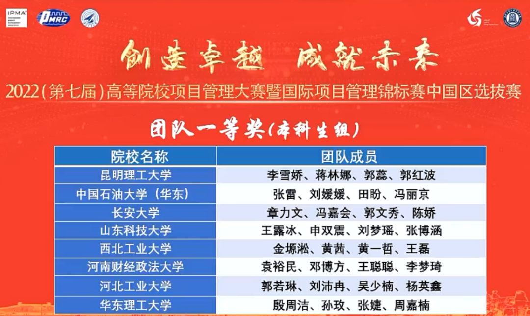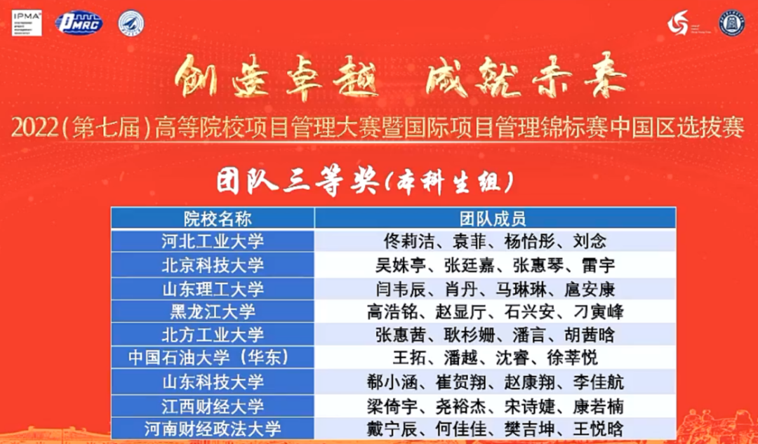 2022年5月29日,第七届高等院校项目管理大赛暨国际项目管理锦标赛中国区选拔赛随着线上颁奖典礼的结束落下帷幕。学院6名学生和工程与房地产管理学院2名学生在许卫华、禹文钢、陶瑾和王雪老师的带领下取得佳绩。