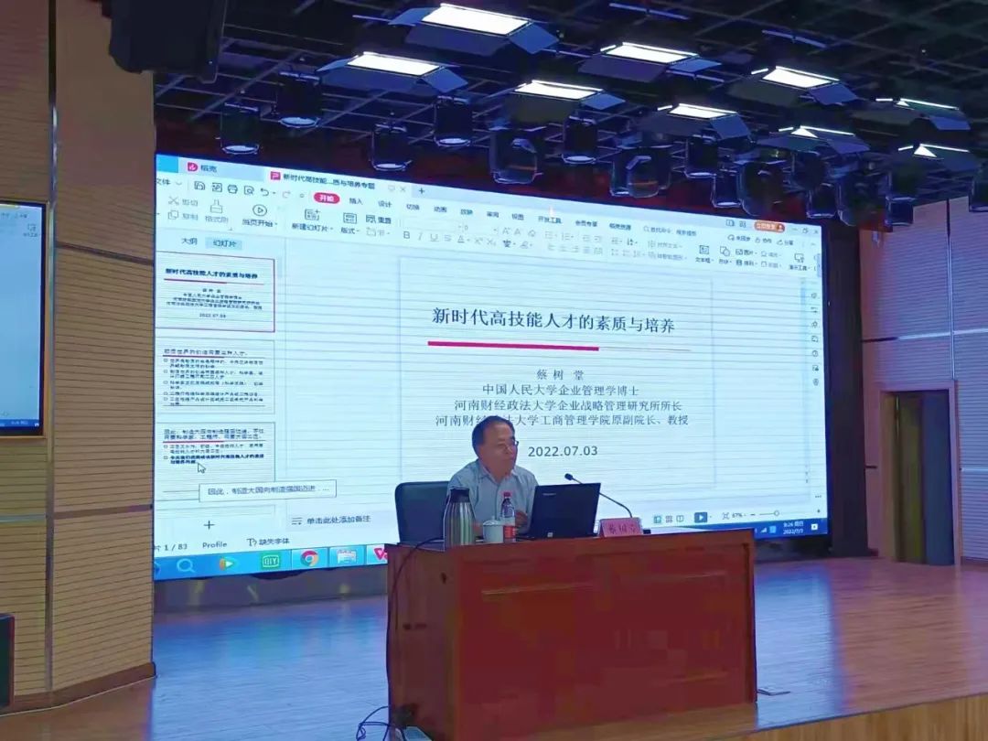 6月30日至7月5日,2022年全省优秀高技能人才素质提升高级进修班在河南省工业和信息化人才交流中心培训基地举办,我院教授蔡树堂应邀为进修班授课,他授课的主题是:新时代高技能人才素质与培养。参加这次进修班的学员为来自全省生产服务一线岗位、从事本职业5年以上并取得技师以上执业证书的在岗人员和从事《中国制造2025河南行动纲要》聚焦的12个重点领域相关工作的高技能人才。
