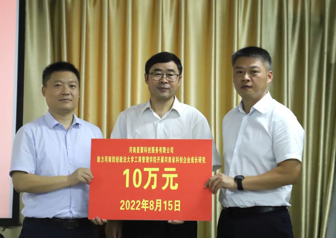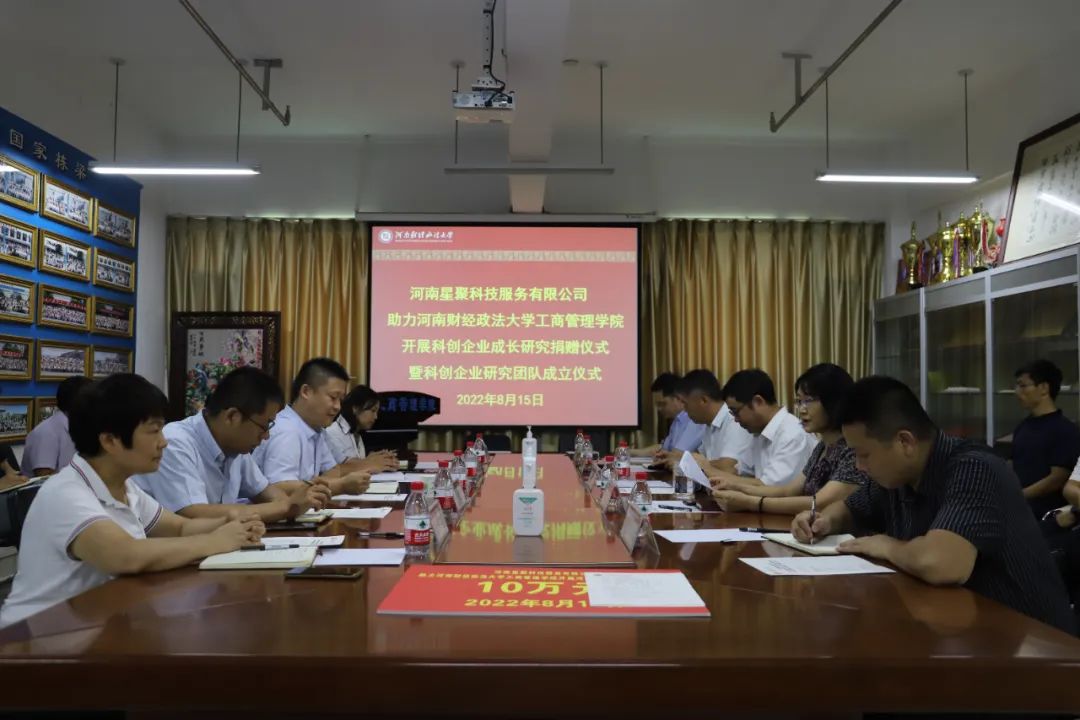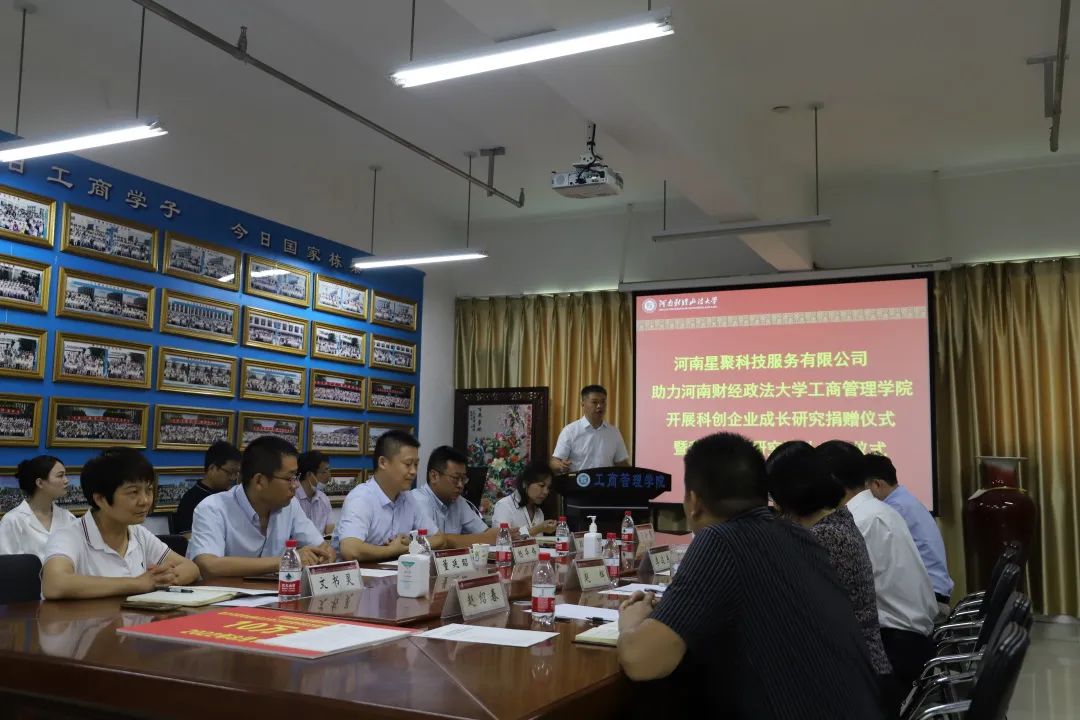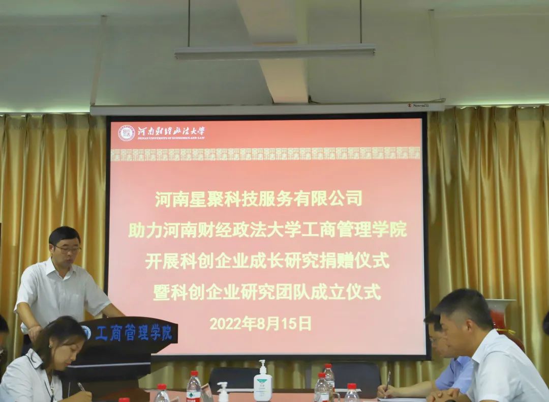 2022年8月15日上午,williamhill英国科创企业成长研究团队成立仪式暨河南星聚科技服务有限公司助力科创企业成长研究捐赠仪式在我校东校区教科楼B座771会议室顺利举行。我校校友办主任李远东,河南星聚科技服务有限公司总经理杨华伟,williamhill英国党委书记赵辉、院长王永伟出席活动。williamhill英国党委副书记赵绍春、副院长王凯及科创企业成长研究团队成员,星聚科技副总经理段利斌、董延昭、马绘慧等一行11人参加活动。仪式由赵辉主持。