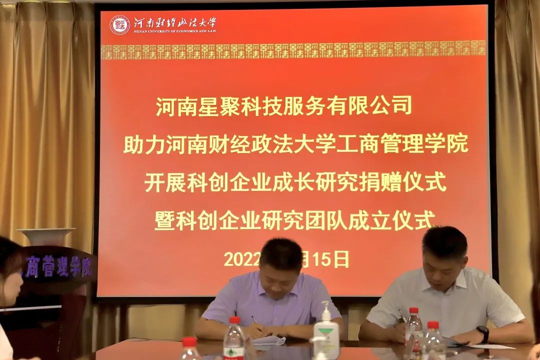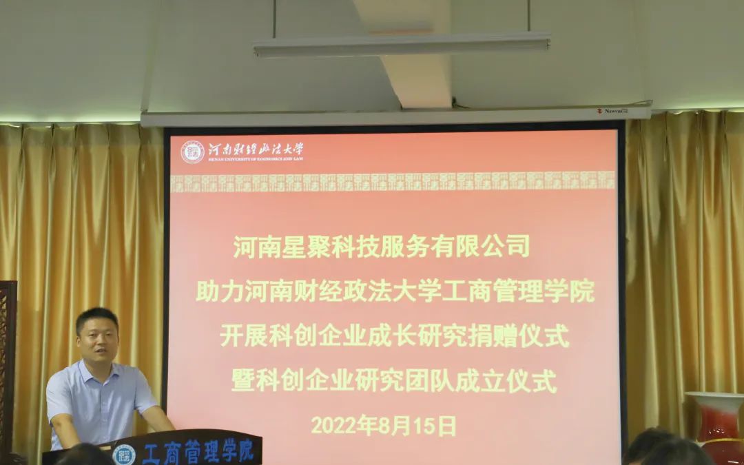 仪式上,李远东、杨华伟、王永伟分别致辞。李远东代表英国威廉集团校友会对校友企业河南星聚科技服务有限公司表示衷心的感谢,对科创企业研究团队的成立表示祝贺。他说,校友是学校发展最热情的关注者、最坚定的支持者,是学校发展的重要依靠力量。河南星聚科技服务有限公司在谋求企业发展的同时,铭记企业使命担当,彰显企业社会责任,不忘公益慈善,慷慨助学为教育事业的发展作出了积极贡献。他希望双方以长远发展为目标,充分发挥各自优势,努力为河南经济事业发展贡献智慧与力量。杨华伟在致辞中表示,作为财大的学子,不遗余力地为母校发展、为河南建设献智出力,是他与企业的追求和责任。双方合作有利于打造一个专业的、根植于河南的科创企业研究团队,服务科创企业家、科技型中小企业,助推河南经济高质量发展。王永伟在致辞中表示,务实而有效的合作是双方共同的心愿,学院希望与企业相互激励、优势互补、开拓创新、共同进步,在对河南省科技型企业发展、河南省科创企业家的培育中作出学院应有的贡献。