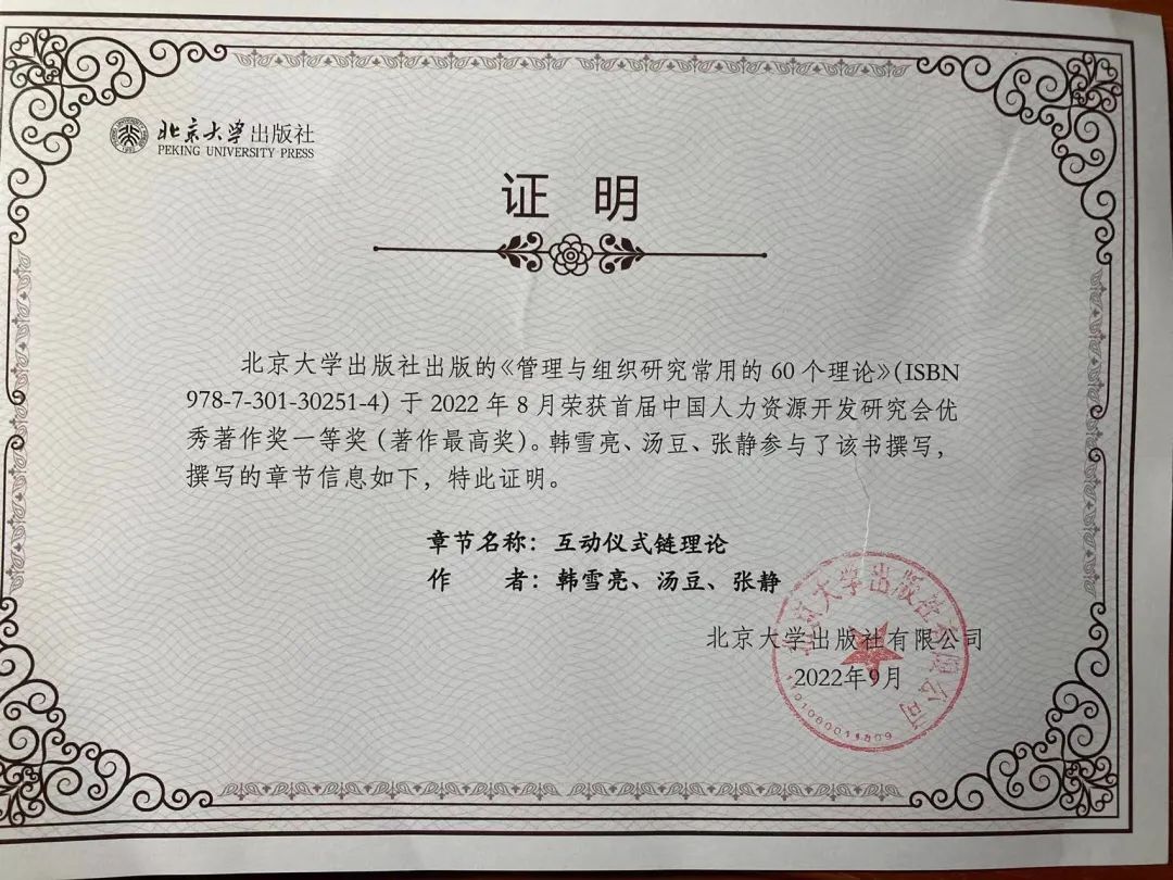 在参与编撰《管理与组织研究常用的60个理论》过程中,韩雪亮带领汤豆、张静两位同学深入研究管理学相关理论,积极克服困难,最终将“互动仪式链理论”编入书中。此次获奖,不仅标志着我院师生科研水平再上新台阶,也将进一步鼓舞专业教师在专业领域继续探索的热情,带动全院师生在科研领域取得新进展。