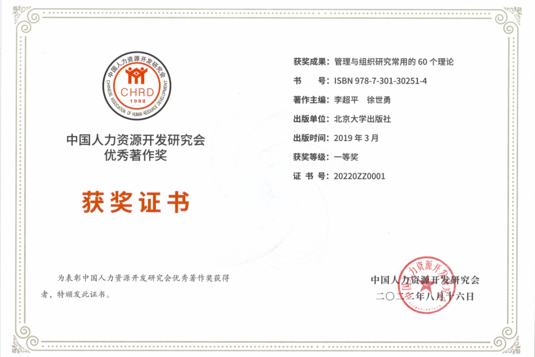 经形式审查、业内专家通信初评、评审委员会复评、研究会终评,评选出了7项优秀著作奖、5项优秀教材奖和6项优秀教学成果奖。我院韩雪亮博士与汤豆、张静两位学生协同全国116名作者撰写的《管理与组织研究常用的60个理论》荣获中国人力资源开发研究会唯一的优秀著作一等奖。