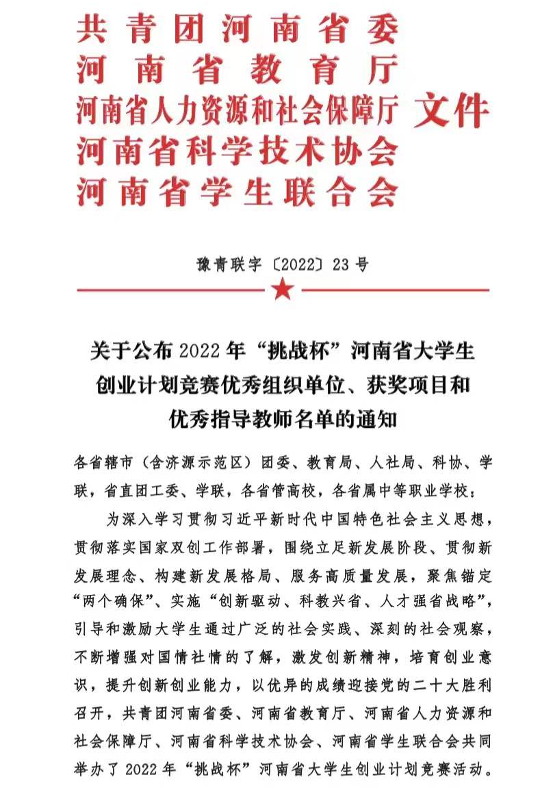 近日,2022年“挑战杯”河南省大学生创业计划竞赛获奖名单公布。我校共有三个项目荣获金奖,其中两个项目来自我院,分别是“昔音——智慧研学履行引领者”、河南曌沣“高分农业”商业计划书,指导教师田启涛、赵绍春荣获2022年 “挑战杯”河南省大学生创业计划竞赛 “优秀指导教师”荣誉称号。