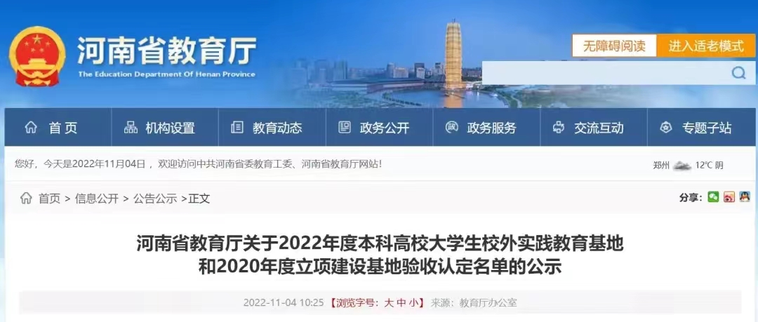 近日,河南省教育厅公布《关于2022年度本科高校大学生校外实践教育基地和2022年度立项建设基地验收认定名单的公示》,我院与郑州上佳食品有限公司共建的新文科(工商管理)实践教育基地被直接认定为省级大学生校外实践教育基地。至此,我院共有3个基地被认定为省级教育基地。