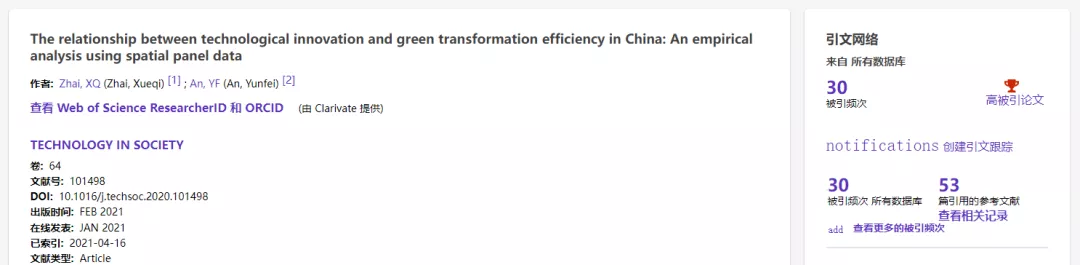 根据科睿唯安于2022年11月公布的ESI最新统计数据,我院教师翟雪琪以第一作者身份在期刊《Technology in Society》(JCR:Q1,SSCI收录,IF:6.879)发表的研究论文“The relationship between technological innovation and green transformation efficiency in China: An empirical analysis using spatial panel data”进入ESI(1%)高被引论文之列。