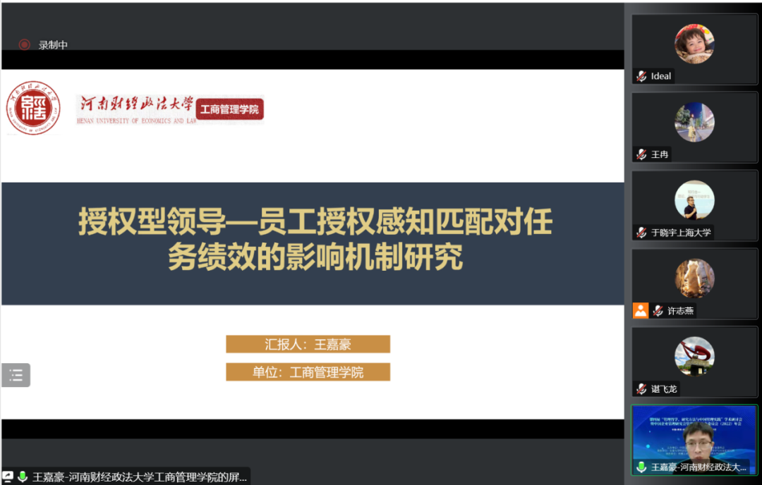 本次研究会由中国企业管理研究会管理哲学专业委员会主办,东南大学经济管理学院、东南大学管理哲学与方法论研究所承办,围绕“复杂系统管理:哲学、方法与实践”,邀请国内外专家学者和企业家进行深度交流,推动跨学科、跨领域的深度交流互动,共同做负责任的、有用的、严谨的学术研究。研究会的平行分论坛设有案例研究、QCA与复杂性管理和实证研究三个主题,在5个平行分论坛上有21篇来自全国各地的论文进行线上报告。我院硕士研究生王嘉豪代表团队作题目为《授权型领导—员工授权感知匹配对任务绩效的影响机制研究》的论文报告,得到江西财经大学谌飞龙教授、上海大学于晓宇教授的点评。