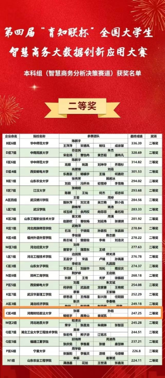 由中国商业经济学会主办,中国MBA精英峰会协办,中南财经政法大学、常州信息职业技术学院承办,武汉育知联信息科技有限公司提供技术支持的第四届“育知联杯”全国大学生智慧商务大数据创新应用大赛全国总决赛于2023年4月8日圆满结束。来自北京航空航天大学、中南财经政法大学、华中师范大学等全国18个省3个直辖市的132所高校参加,339支队伍、1624名学生线上同台竞技。我院杨铭宇、席青山、袁斌凯3名同学在张娜、孙彪两位老师的带领下,取得全国二等奖佳绩。