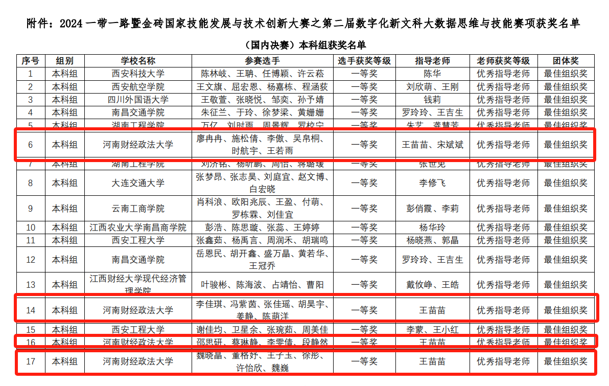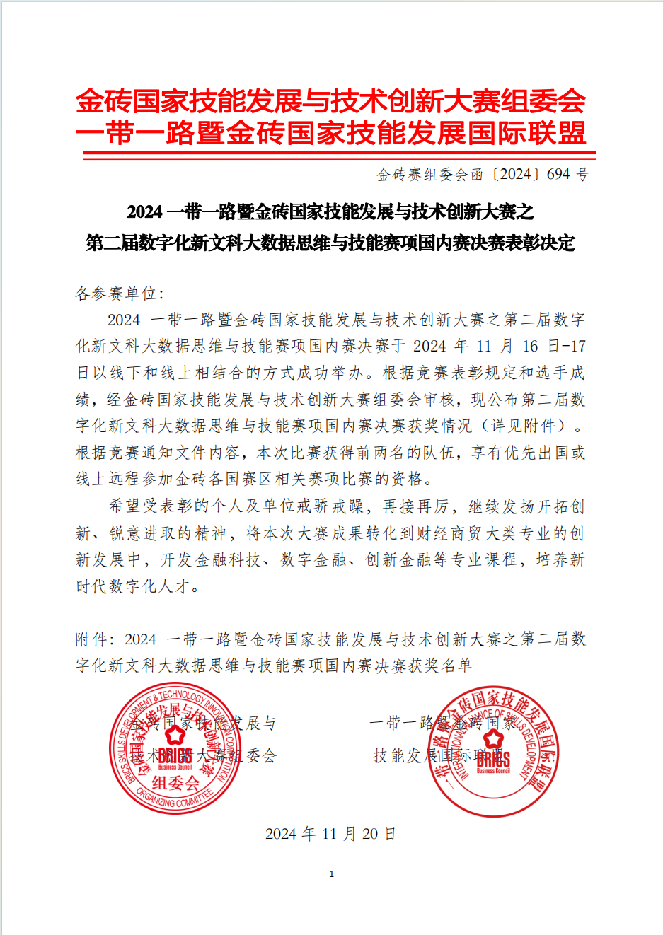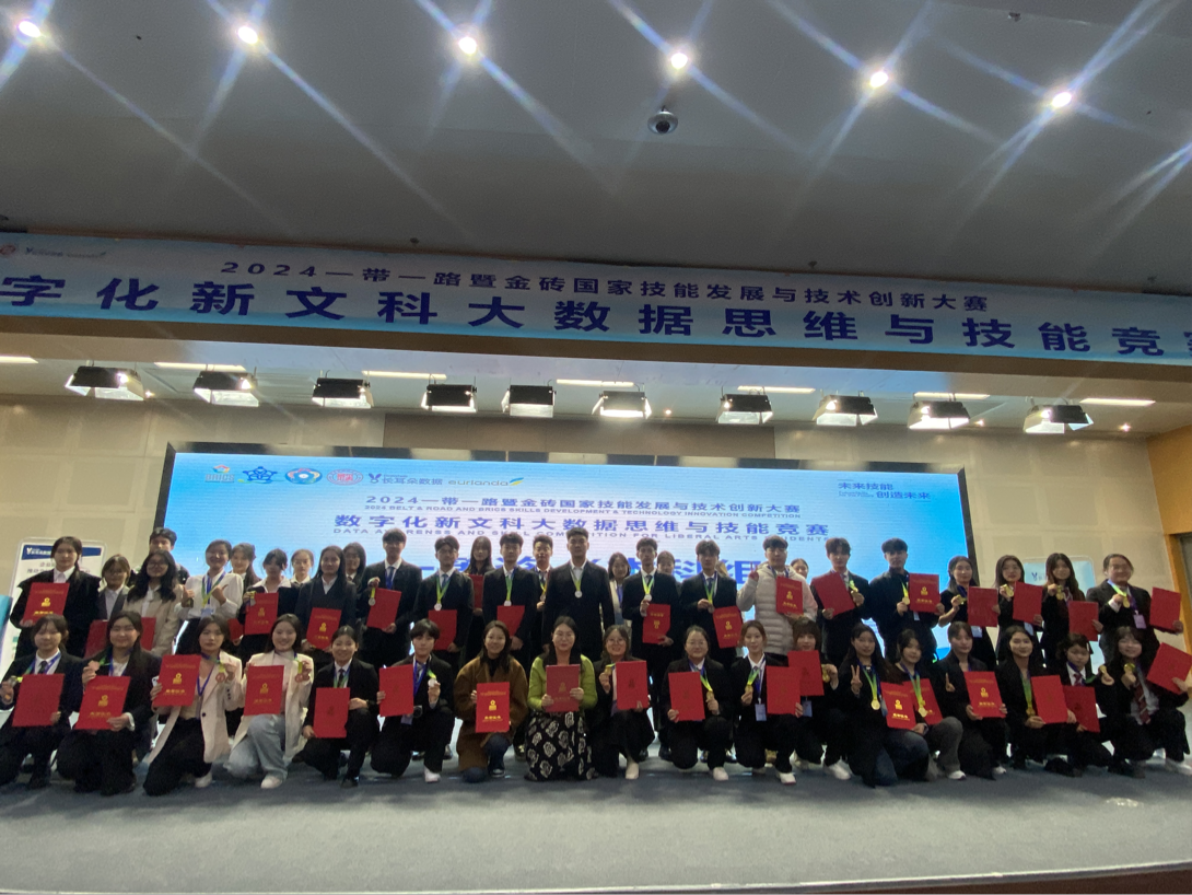 11月16日-11月17日,2024一带一路暨金砖国家技能发展与技术创新大赛之数字化新文科大数据思维与技能竞赛总决赛在我校成功举行。本次赛项由金砖国家工商理事会中方理事会、一带一路暨金砖国家技能发展国际联盟、中国科协“一带一路”暨金砖国家技能发展与技术创新培训中心主办,中国发明协会、教育部中外人文交流中心联合主办,金砖国家工商理事会技能发展、应用技术与创新中方工作组承办,英国威廉集团、上海长耳朵数据科技有限公司、悦岚(上海)数据服务有限公司等联合承办。