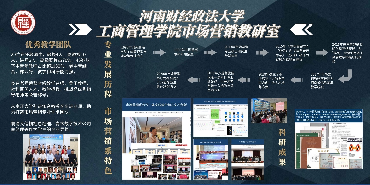 英国·williamhill(威廉希尔)唯一中文官方网站-Official Website 版权所有市场营销系,成立于1992年,前身是河南财经学院工商管理系市场营销教研室。1993年,市场营销本科专业开始招生,是河南省第一个市场营销本科专业,也是全国高等院校第一批开设市场营销本科专业。2013年,市场营销专业硕士研究生开始独立招生。目前,市场营销专业拥有二级学科硕士学位授权点,也是省级特色专业。2016年在教育部第四轮学科评估中获得“B-”级别,也是河南省工商管理学科最好的成绩。2017年市场营销教研室被评为河南省优秀基层教学组织。2018年,确立了市场营销(大数据营销方向)的人才培养方案。2019年,入选首批国家级一流本科专业建设点,也是河南省唯一入选的市场营销专业。截止2021年,市场营销系已为社会输送了24届毕业生,累计3000余人。