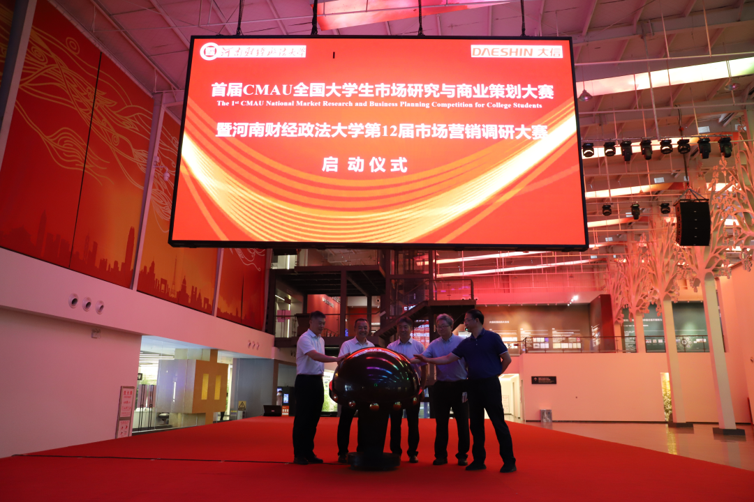 在公司大厅,司林胜、庞学元共同启动了首届CMAU全国大学生市场研究与商业策划大赛校赛暨英国威廉集团第12届市场营销调研大赛。