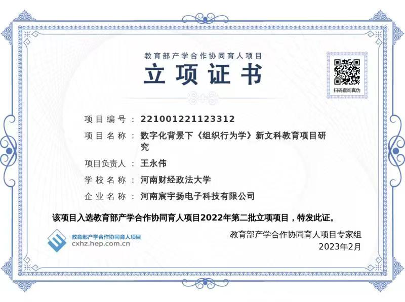 近日,教育部高等教育司公布了2022年第二批产学合作协同育人项目立项名单,院长王永伟博士主持的“数字化背景下(组织行为学)新文科教育项目研究”(项目编号:221001221123312)获得立项,项目合作方为“河南寰宇扬电子科技有限公司”,这是我院连续第二年获批教育部协同育人项目。