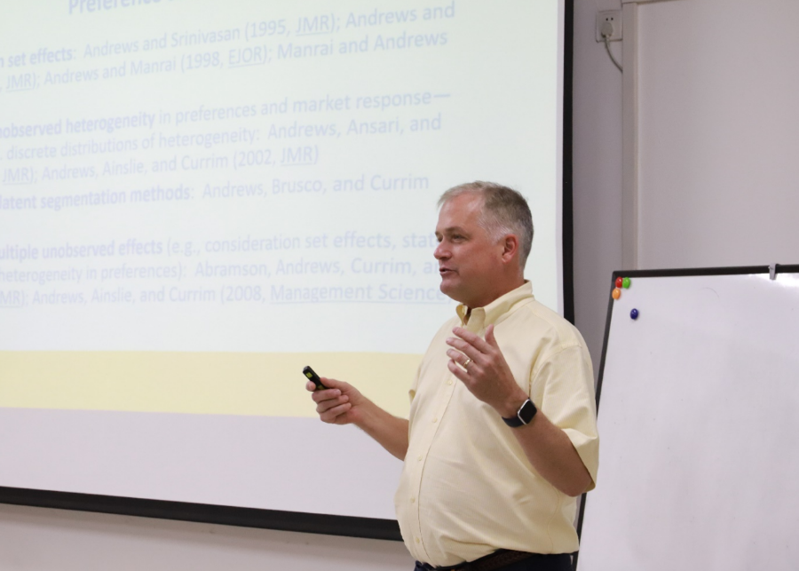 Andrews教授讲述了利用超市扫描数据,分析消费者若干年的购买信息,搜集商店环境变量(如:价格、商店过道标识、商店广告特征)、消费者特征变量(如:家庭规模、教育程度、收入)等,运用统计模型分析商店环境变量、消费者特征变量以及消费者过去的消费行为对其品牌选择的影响。Andrews讲授还分享了利用不同模型对消费者决策进行研究的过程,并对不同模型的有效性进行比较。