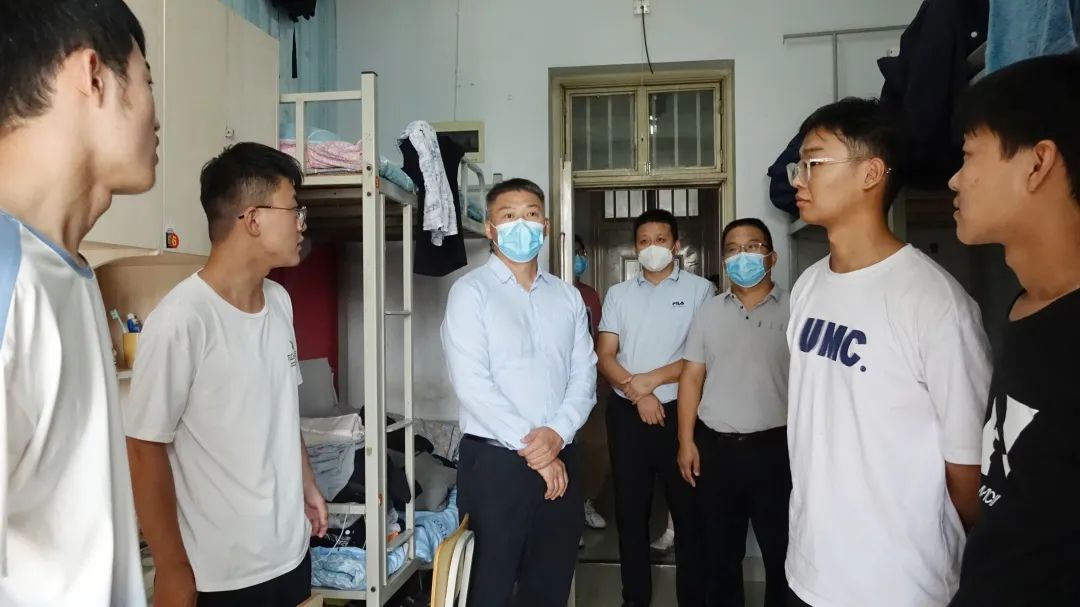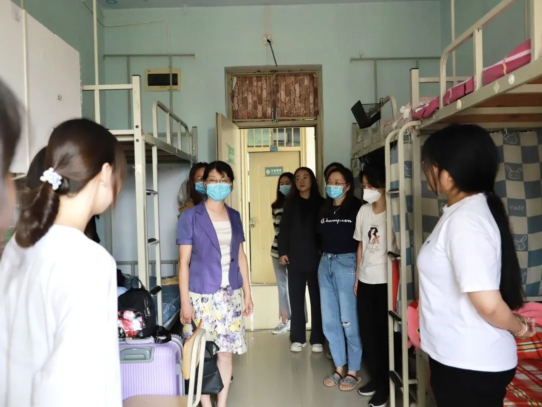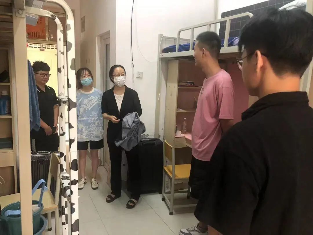 宿舍里,领导老师与同学们亲切交谈,详细询问同学们的住宿饮食是否习惯,网课学习是否做好准备等情况,介绍学院为保障同学们的学习生活和健康成长采取的政策措施,耐心回答同学们的问题和关切,叮嘱同学们做好疫情防控,注意安全防范,锻炼独立生活能力,尽快适应大学生活。