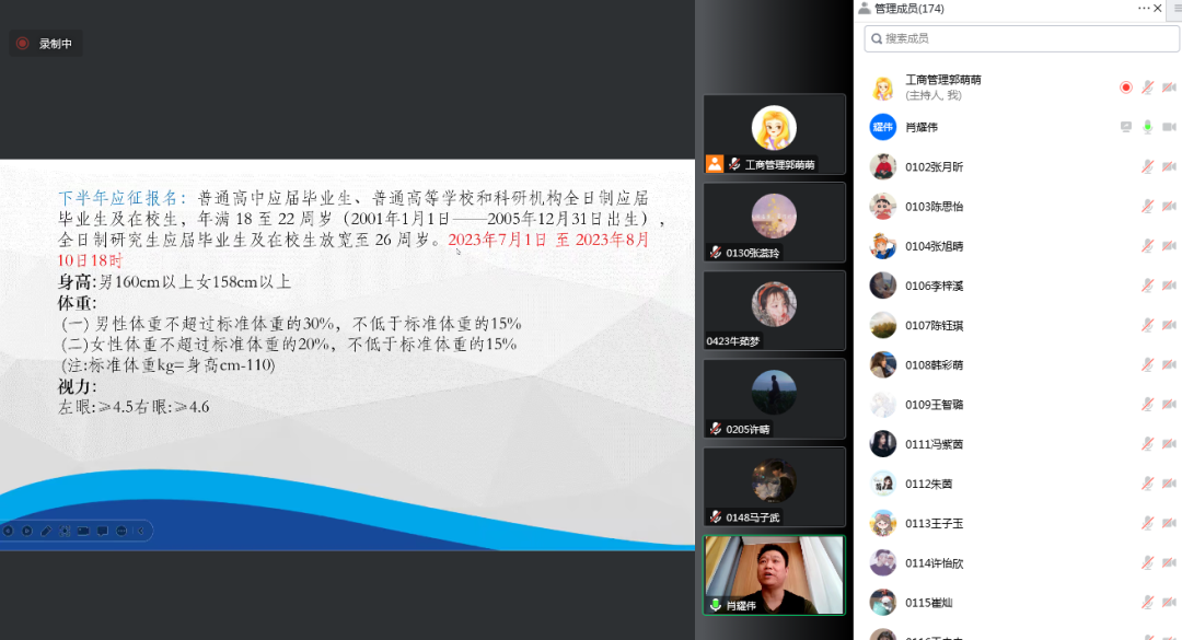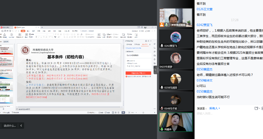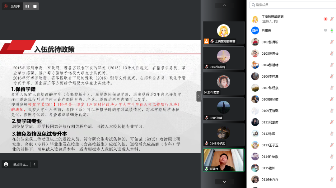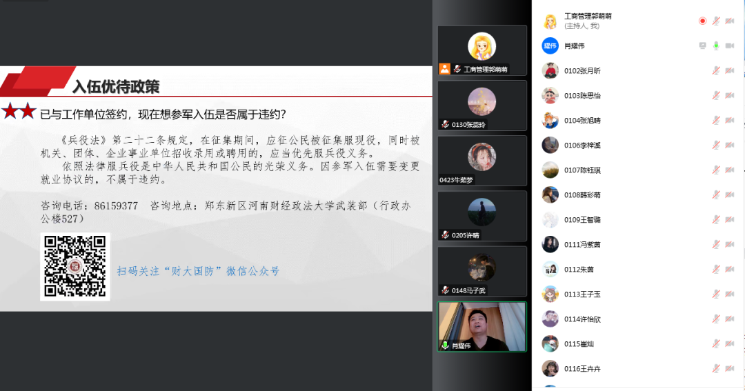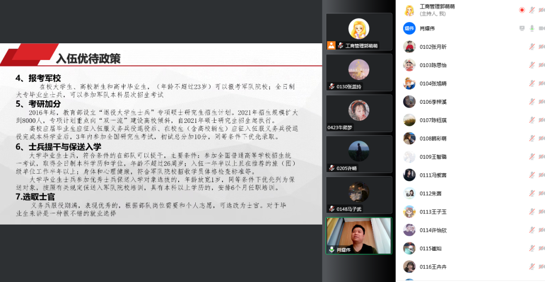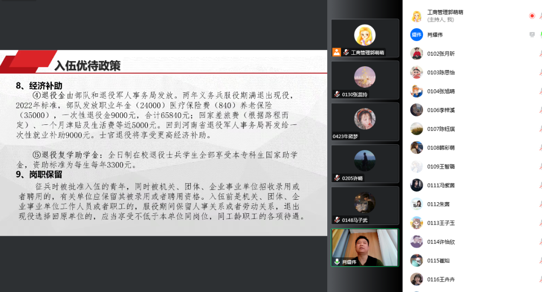肖耀伟从征兵时间、参军基本条件、报名流程、体检政策四个方面讲解了参军入伍的注意事项,从保留学籍、复学转专业、推免资格及免试专升本、报考军校、考研加分、士兵提干与保送入学、选取士官、经济补助、岗职保留九个方面分析了入伍优待政策。他结合自身经历与当下形势,为同学们顺利入伍提供了建议,并对同学们提出的问题做了详细解答。