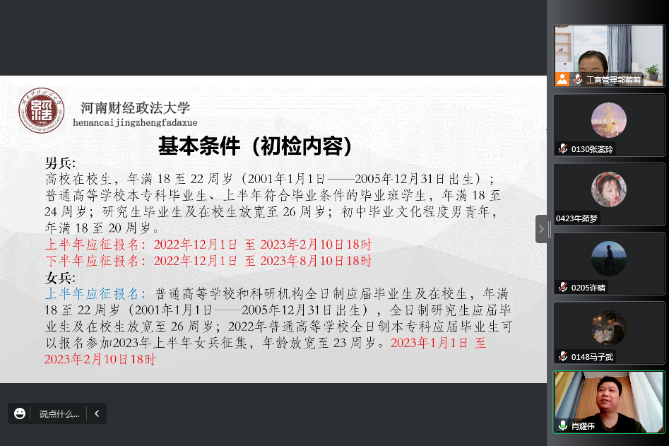 12月13日,我院举办新生入学教育专题讲座。武装部老师肖耀伟受邀作主题为《大学生应征入伍政策详解》的讲座,辅导员郭萌萌主持会议,22级全体新生与会聆听。