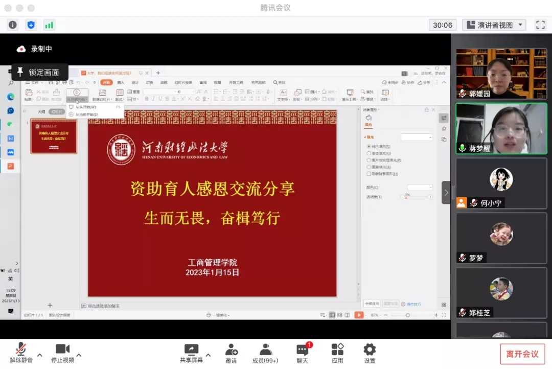 郭媛园在宣传大使分享的基础上对国家资助政策的目的和意义进行了阐释,希望同学们以三名宣传大使为榜样,做好学业规划和职业规划,不负四年大学时光,以优异的成绩迈向更加灿烂辉煌的人生。
