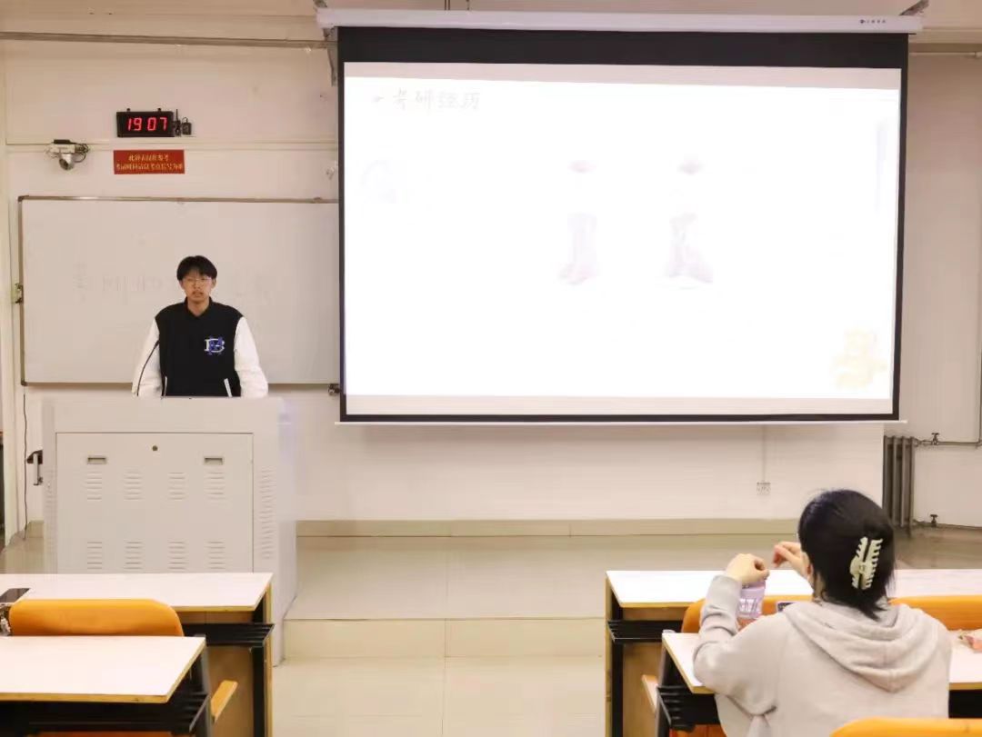 4月20日晚,我院在第一教学楼120教室举办“创建优良学风,‘研’续青春梦想”考研助推指导交流会。本次交流会邀请学院2019级三名考研成功上岸的优秀学生姚首杰、校林星、谢康担任主讲人,近百名学生到会聆听。