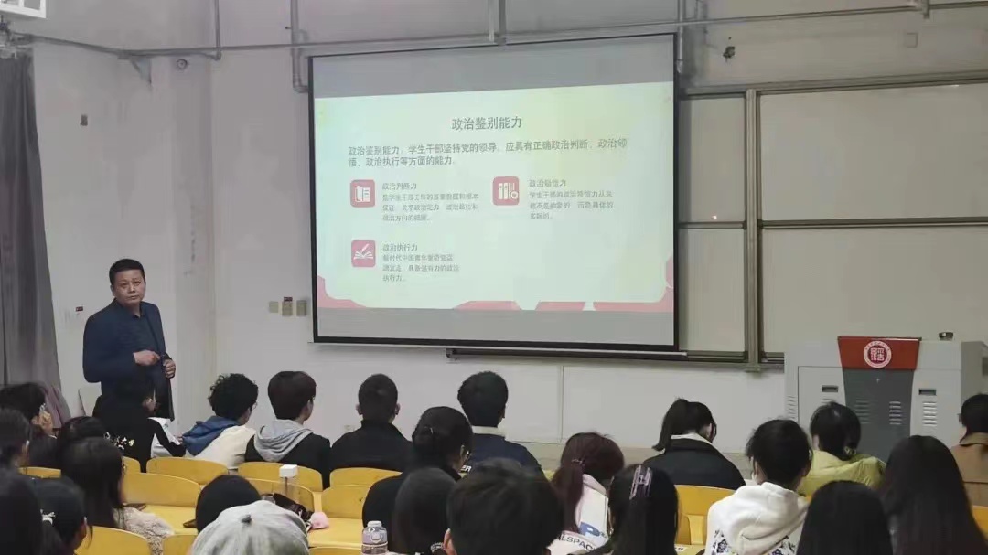 赵绍春围绕学生干部应具备的能力素养这个主题,从政治鉴别能力、思想引领能力、学业示范能力、自我反省能力、主动学习能力和管理协调能力等六个方面做了深刻阐释。他强调,学生干部应当在政治上和学业上充分发挥“双带头”作用,一是要认真参加“学习强国”、“青年大学习”、“主题团日活动”等政治学习,筑牢思想之基;二是要努力做到“全心全意为同学服务”,在学习学业上做好模范带头,共同建设好良好的班风学风。赵绍春对全体学员寄予了热切期望,希望同学们做政治可靠、学习优良的新时代大学生干部。