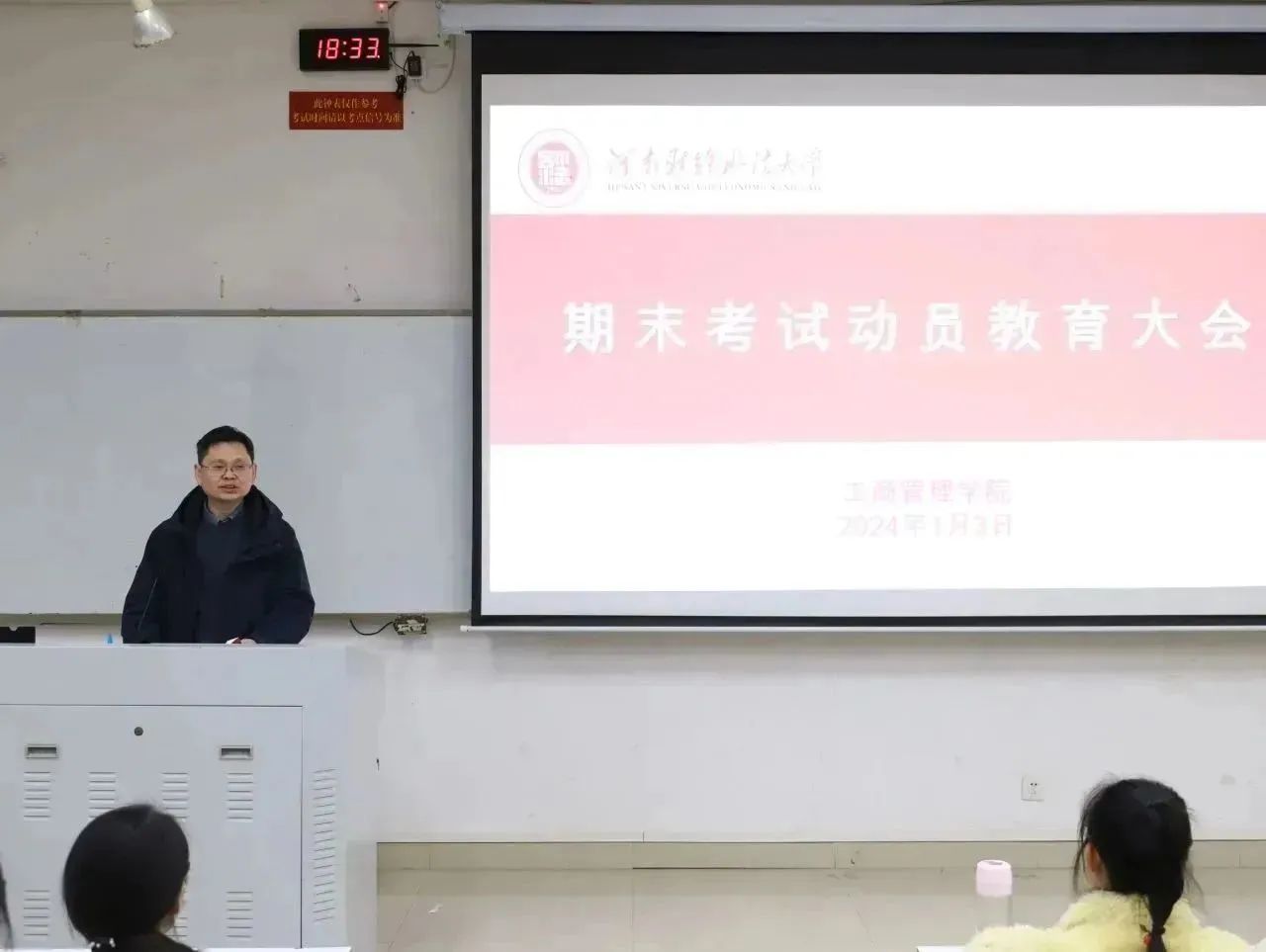 1月3日,学院在教科楼A208教室、教二119教室分别召开期末考试动员教育大会,副院长王凯讲解了我校《学生手册》中关于考试违纪、考试作弊的相关规定,提示同学们严格遵守考试纪律,自觉抵制作弊行为,树立良好的考试风气。副书记赵绍春强调,考试是检验学习成果的重要手段,每个学生都应认真备考,正确对待。对考试违纪、考试作弊行为,学院将进行严肃处理,确保考试的公平公正。