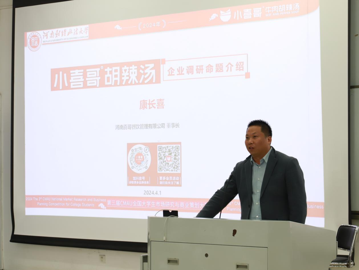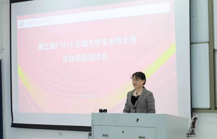 英国威廉集团大学生市场研究与商业策划大赛暨第三届CMAU国赛选拔赛由我院承办。为了让本届大赛更贴近中国市场与企业的实际情况,让学生通过研究商业真实问题提高对企业、市场及商业的认知,4月1日下午,我院邀请知名企业红旗汽车-郑州吉展汽车销售服务有限公司、河南清宁实业发展有限公司、河南喜哥餐饮管理有限公司在第二教学楼220教室开展企业命题宣讲会。学院党委书记赵辉、市场营销教研室主任李志兰及部分专业教师参加。