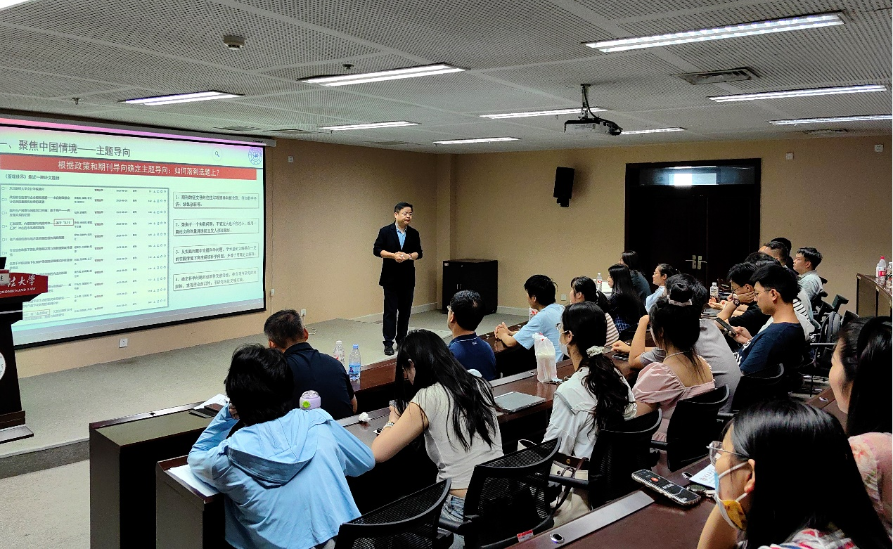 报告中,马鸿佳讲授了高层次论文写作的思维方法以及研究范式。他结合自身在《管理世界》《南开管理评论》等期刊发表论文的经历,从聚焦中国情景、凝练科学问题、强化文章逻辑、投稿返修经验四个部分阐述了国内权威期刊选题和发文经验。此外,他还分享了期刊风格、理论贡献、研究方法的经验,提出要注重把论文写在祖国大地上,致力于解决现实具体问题。会后,结合论文选题,研究方法选择等问题,马鸿佳与我院师生进行充分深入的交流讨论。